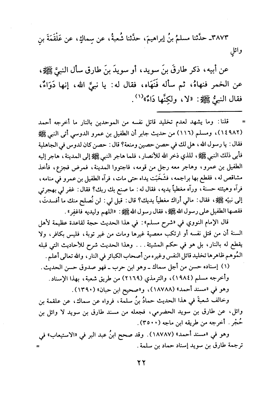 وخالف شعبةَ في هذا الحديث حمادُ بنُ سلمة، فرواه عن سماك، عن علقمة بن وائل، عن طارق بن سويد الحضرمي، فجعله من مسند طارق بن سويد لا وائل بن حُجْر. أخرجه من طريقه ابن ماجه (٣٥٠٠).
