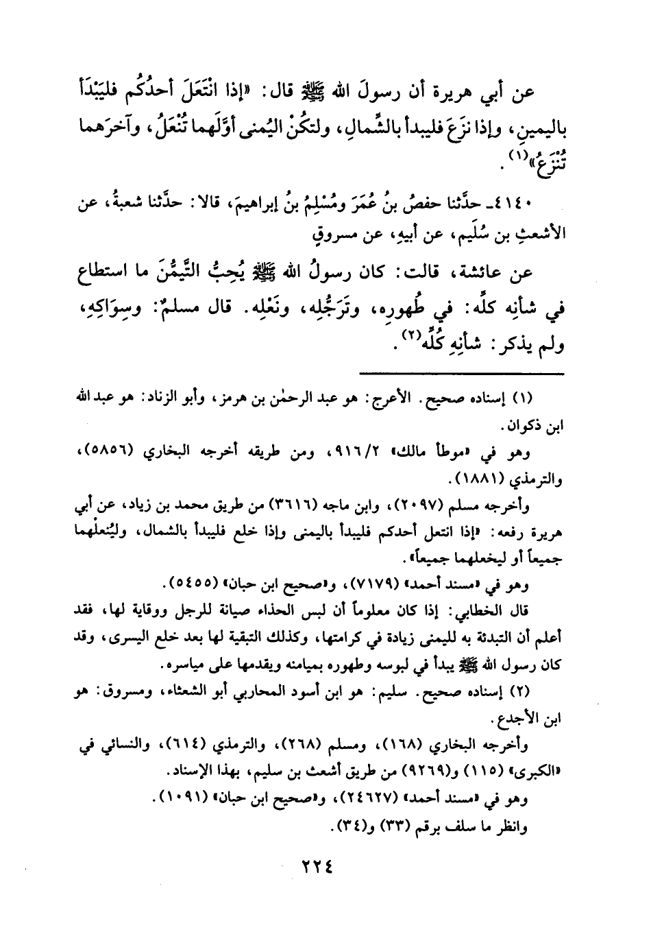عن أبي هريرة أن رسولَ الله - صلَّى الله عليه وسلم - قال: "إذا انْتَعَلَ أحدُكُم فليَبْدَأ باليمينِ، وإذا نزَعَ فليبدأ بالشِّمالِ، ولتكُنْ اليُمنى أوَّلَهما تُنْعَلُ، وآخرَهما تُنْزَعُ" (¬١).