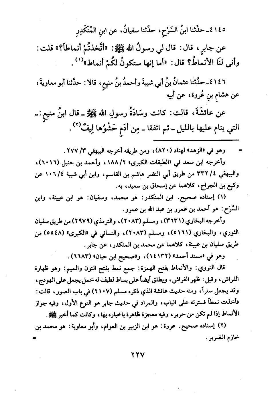 قال النووي: والأنماط بفتح الهمزة: جمع نمط بفتح النون واليم: وهو ظهارة الفراش، وقيل: ظهر الفراش، ويطلق أيضاً على بساط لطيف له خمل يجعل على الهودج، وقد يجعل ستراً، ومنه حديث عائشة الذي ذكره مسلم (٢١٠٧) في باب الصور، قالت: فأخذت نمطاً فسترته على الباب، والمراد في حديث جابر هو النوع الأول، وفيه جواز الأنماط إذا لم تكن من حرير، وفيه معجزة ظاهرة باخباره بها، وكانت كما أخبر - صلَّى الله عليه وسلم -