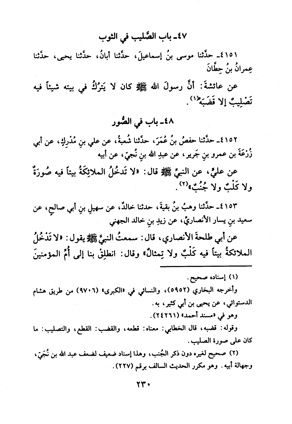 عن عليٍّ، عن النبيِّ -صلَّى الله عليه وسلم- قال: "لا تَدخُلُ الملائِكَةُ بيتاً فيه صُورَةٌ ولا كَلْبٌ ولا جُنُبٌ" (¬٢).