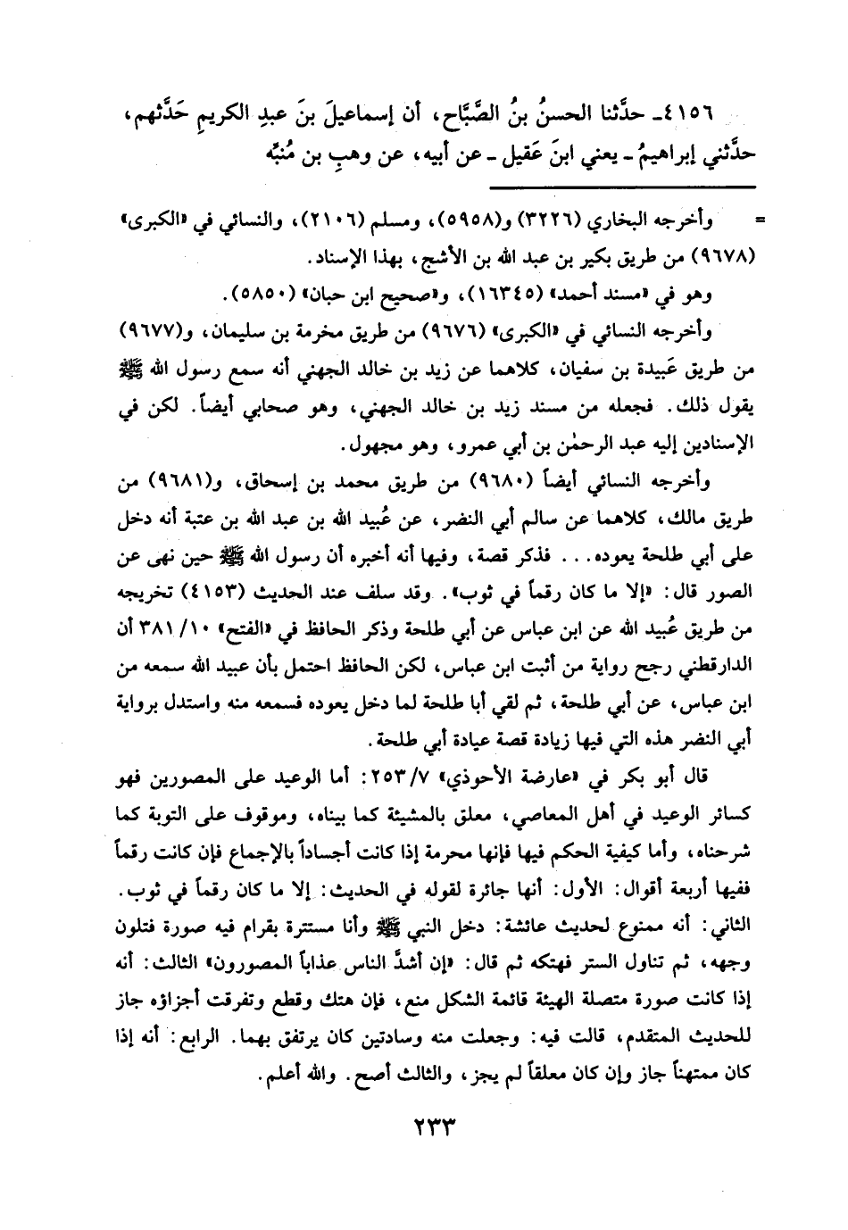 وأخرجه النسائي أيضاً (٩٦٨٠) من طريق محمد بن إسحاق، و (٩٦٨١) من طريق مالك، كلاهما عن سالم أبي النضر، عن عُبيد الله بن عبد الله بن عتبة أنه دخل على أبي طلحة يعوده ... فذكر قصة، وفيها أنه أخبره أن رسول الله - صلَّى الله عليه وسلم - حين نهى عن الصور قال: "إلا ما كان رقما في ثوب". وقد سلف عند الحديث (٤١٥٣) تخريجه من طريق عُبيد الله عن ابن عباس عن أبي طلحة وذكر الحافظ في "الفتح" ١٠/ ٣٨١ أن الدارقطني رجح رواية من أثبت ابن عباس، لكن الحافظ احتمل بأن عبيد الله سمعه من ابن عباس، عن أبي طلحة، ثم لقي أبا طلحة لما دخل يعوده فسمعه منه واستدل برواية أبي النضر هذه التي فيها زيادة قصة عيادة أبي طلحة.
