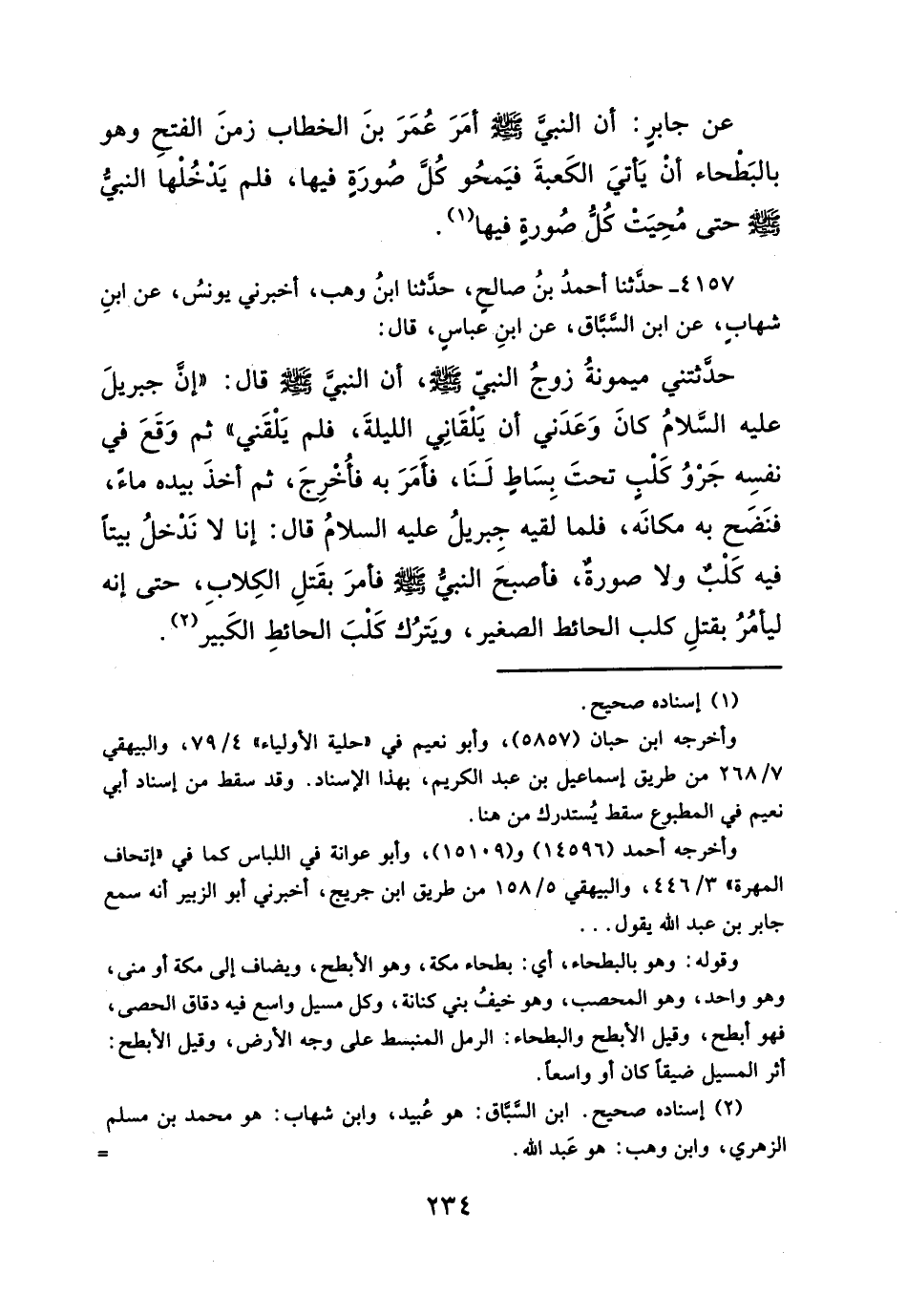 حدَّثتني ميمونةُ زوجُ النبيّ - صلَّى الله عليه وسلم -، أن النبيَّ -صلَّى الله عليه وسلم- قال: "إنَّ جبريلَ عليه السَّلامُ كانَ وَعَدَني أن يَلْقَانِي الليلةَ، فلم يَلْقَني" ثم وَقَعَ في نفسِه جَرْوُ كلْبٍ تحتَ بِسَاطٍ لَنَا، فأمَرَ به فأُخْرِجَ، ثم أخذَ بيده ماءً، فنَضَح به مكانَه، فلما لقيه جِبريلُ عليه السلامُ قال: إنا لا نَدْخلُ بيتاً فيه كَلْبٌ ولا صورةٌ، فأصبحَ النبيُّ -صلَّى الله عليه وسلم- فأمرَ بقَتلِ الكِلابِ، حتى إنه ليأمُرُ بقتلِ كلب الحائط الصغير، ويَترُك كَلْبَ الحائطِ الكَبير (¬٢).