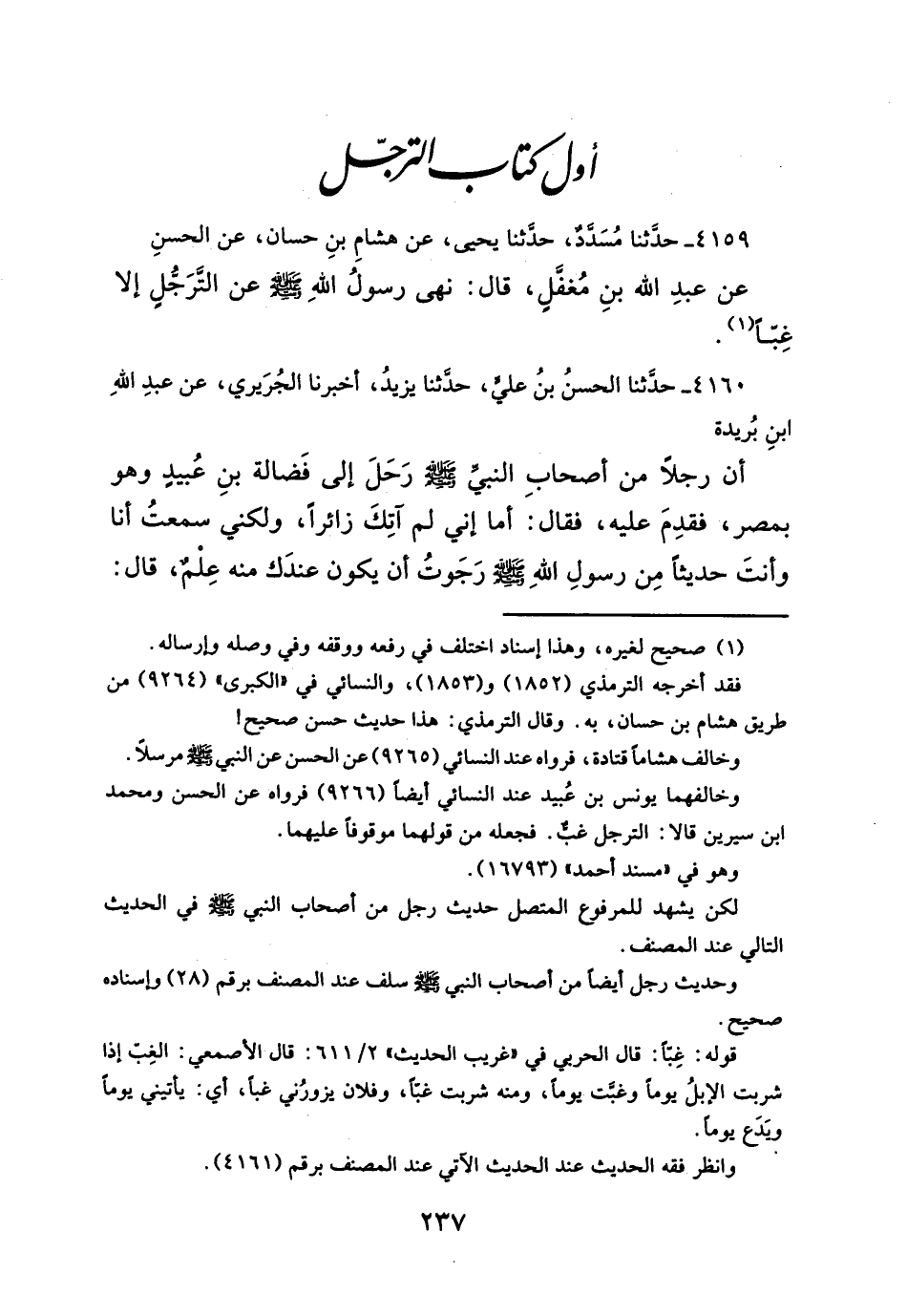 عن عبدِ الله بنِ مُغفَّلٍ، قال: نهى رسولُ الله - صلَّى الله عليه وسلم - ِعن التَّرَجُّلٍ إلا غِبّاً (¬١).