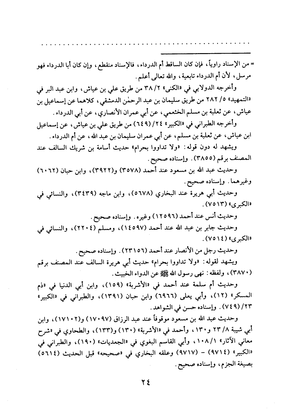 ويشهد لقوله: "ولا تداووا بحرام" حديث أبي هريرة السالف عند المصنف برقم (٣٨٧٠)، ولفظه: نهى رسول الله - صلَّى الله عليه وسلم - عن الدواء الخبيث.
