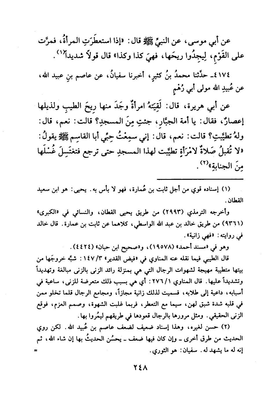 عن أبي هريرة، قال: لَقِيَتهُ امرأةٌ وجَدَ منها رِيحَ الطيبِ ولذيلها إعصارٌ، فقال: يا أمة الجبَّارِ، جئتِ مِنَ المسجدِ؟ قالت: نعم، قال: ولهُ تطيَّبتِ؟ قالت: نعم، قال: إني سمِعْتُ حِبِّي أبا القاسِم -صلَّى الله عليه وسلم- يقولُ: "لا تُقبلُ صَلاةٌ لامْرَأةِ تطيَّبت لهذا المسجدِ حتى ترجع فتغتَسِلَ غُسْلَها مِنَ الجنابةِ" (¬٢).