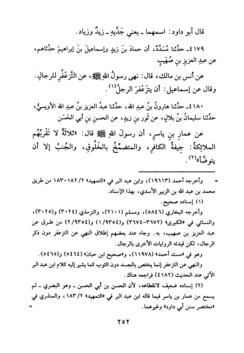 عن عمارِ بنِ ياسرٍ، أن رسولَ الله - صلَّى الله عليه وسلم - ِ قال: "ثلاثَةٌ لا تَقْربُهُم الملائِكةُ: جيفةُ الكافرِ، والمتضمِّخُ بالخَلُوقِ، والجُنبُ إلا أن يتوضَّأ" (٢).