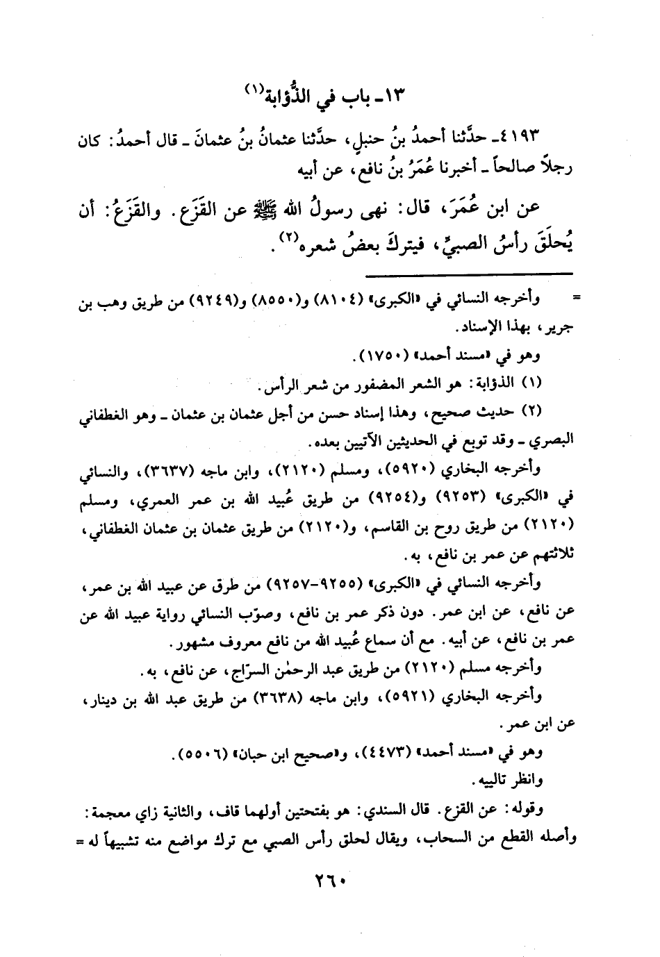 عن ابن عُمَرَ، قال: نهى رسولُ الله - صلَّى الله عليه وسلم - عن القَزَع. والقَزَعُ: أن يُحلَقَ رأسُ الصبيِّ، فيتركَ بعضُ شعره (¬٢).