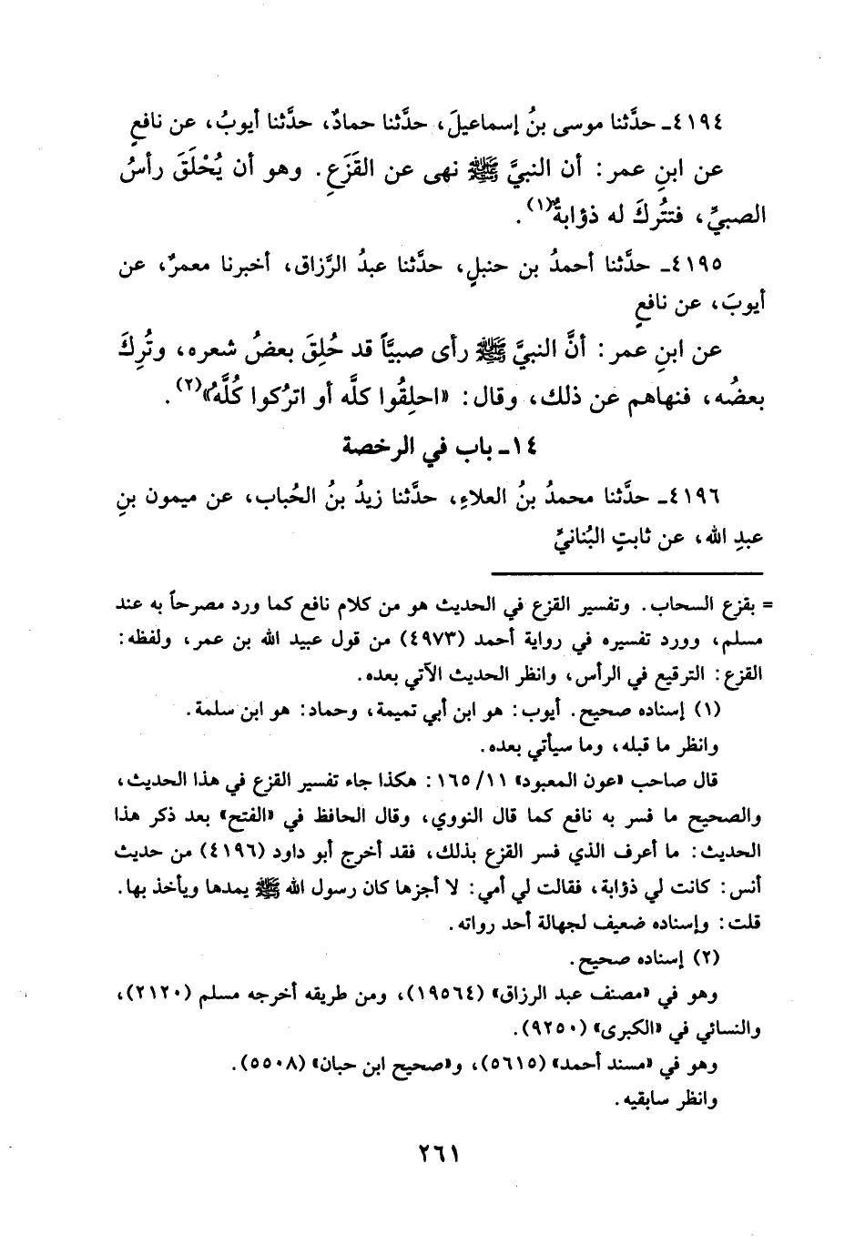 قال صاحب "عون المعبود" ١١/ ١٦٥: هكذا جاء تفسير القزع في هذا الحديث، والصحيح ما فسر به نانع كما قال النووي، وقال الحافظ في "الفتح" بعد ذكر هذا الحديث: ما أعرف الذي فسر القزع بذلك، فقد أخرج أبو داود (٤١٩٦) من حديث أنس: كانت لي ذؤابة، فقالت لي أمي: لا أجزها كان رسول الله -صلَّى الله عليه وسلم- يمدها ويأخذ بها.