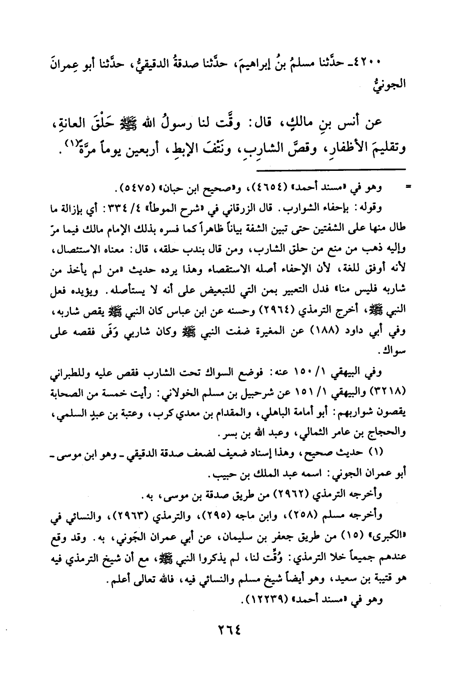 عن أنس بنِ مالكٍ، قال: وقَّت لنا رسولُ الله - صلَّى الله عليه وسلم - حَلْقَ العانةِ، وتقليمَ الأظفارِ، وقصَّ الشارِبِ، ونَتْفَ الإبطِ، أربعين يوماً مرَّةً (¬١).