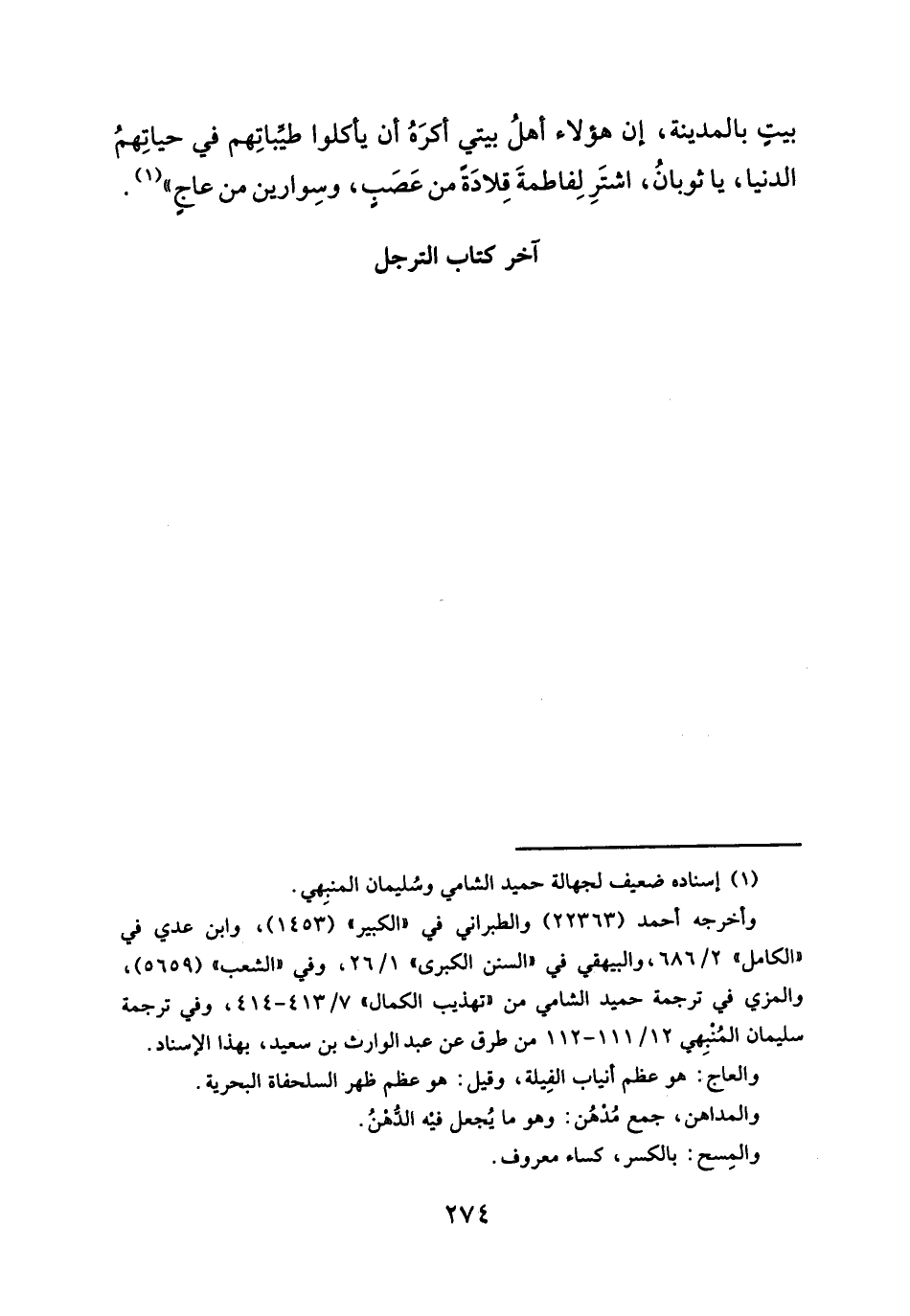 بيتٍ بالمدينة، إن هؤلاء أهلُ بيتي أكرَهُ أن يأكلوا طيِّباتِهم في حياتِهمُ الدنيا، يا ثوبان، اشتَرِ لِفاطمةَ قِلادَةً من عَصَبٍ، وسِوارين من عاجٍ" (¬١).