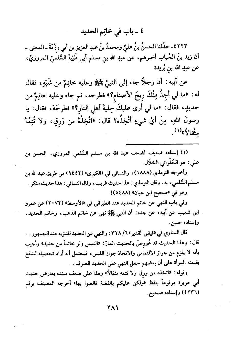 عن أبيه: أن رجلاً جاء إلى النبيِّ -صلَّى الله عليه وسلم- وعليه خاتِمٌ من شَبَهٍ، فقال له: "ما لي أجِدُ مِنْكَ رِيحَ الأصنامِ؟ " فطرحه، ثم جاء وعليه خاتِمٌ من حديدٍ، فقال: "ما لي أرى عليكَ حِليةَ أهلِ النارِ؟ " فطرحَهَ، فقال: يا رسولَ الله - صلَّى الله عليه وسلم -، مِن أيِّ شيءٍ أتَّخِذُه؟ قال: اتَّخِذْهُ من وَرِقٍ، ولا تُتِمَّهُ مِثقالاً" (¬١).