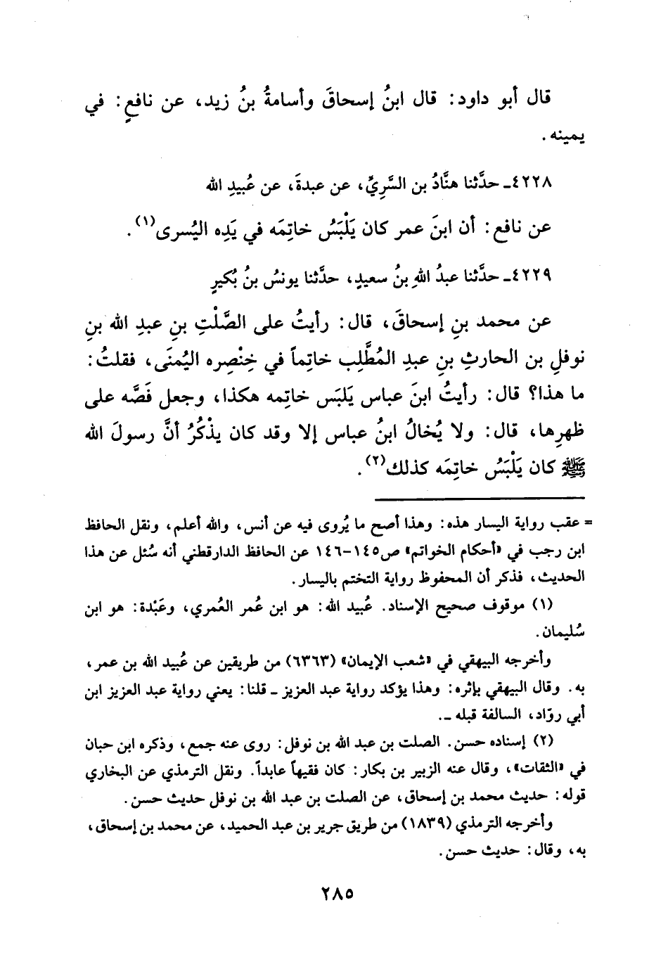 ٤٢٢٨ - حدَّثنا هنَّادُ بن السَّرِيِّ، عن عبدةَ، عن عُبيدِ الله عن نافع: أن ابنَ عمر كان يَلْبَسُ خاتِمَه في يَدِه اليُسرى (¬١).