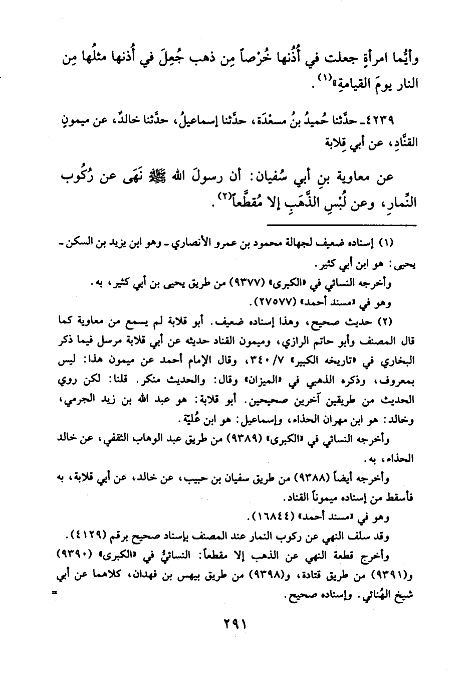 عن معاوية بنِ أبي سُفيان: أن رسولَ الله - صلَّى الله عليه وسلم - نَهَى عن رُكُوب النِّمارِ، وعن لُبْسِ الذَّهَبِ إلا مُقطَّعاً (¬٢).