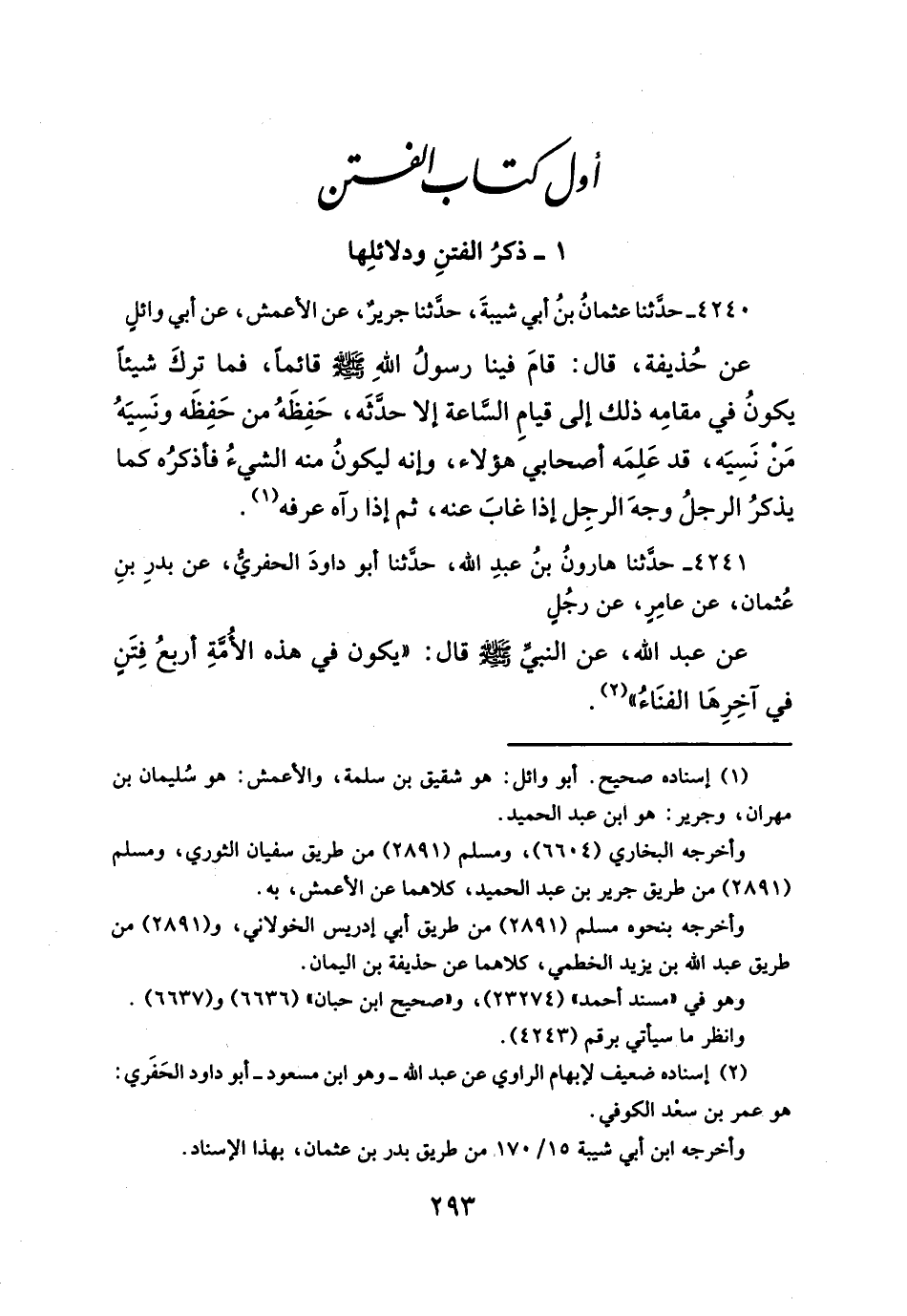 ٤٢٤٠ - حدَّثنا عثمانُ بنُ أبي شيبةَ، حدَّثنا جريرٌ، عن الأعمش، عن أبي وائلٍ عن حُذيفة، قال: قامَ فينا رسولُ اللهِ -صلَّى الله عليه وسلم- قائماً، فما تركَ شيئاً يكونُ في مقامِه ذلك إلى قيامِ السَّاعة إلا حدَّثَه، حَفِظَهُ من حَفِظَه ونَسِيَهُ مَنْ نَسِيَه، قد عَلِمَه أصحابي هؤلاء، وإنه ليكونُ منه الشيءُ فأذكرُه كما يذكرُ الرجلُ وجهَ الرجِل إذا غابَ عنه، ثم إذا رآه عرفه (¬١).