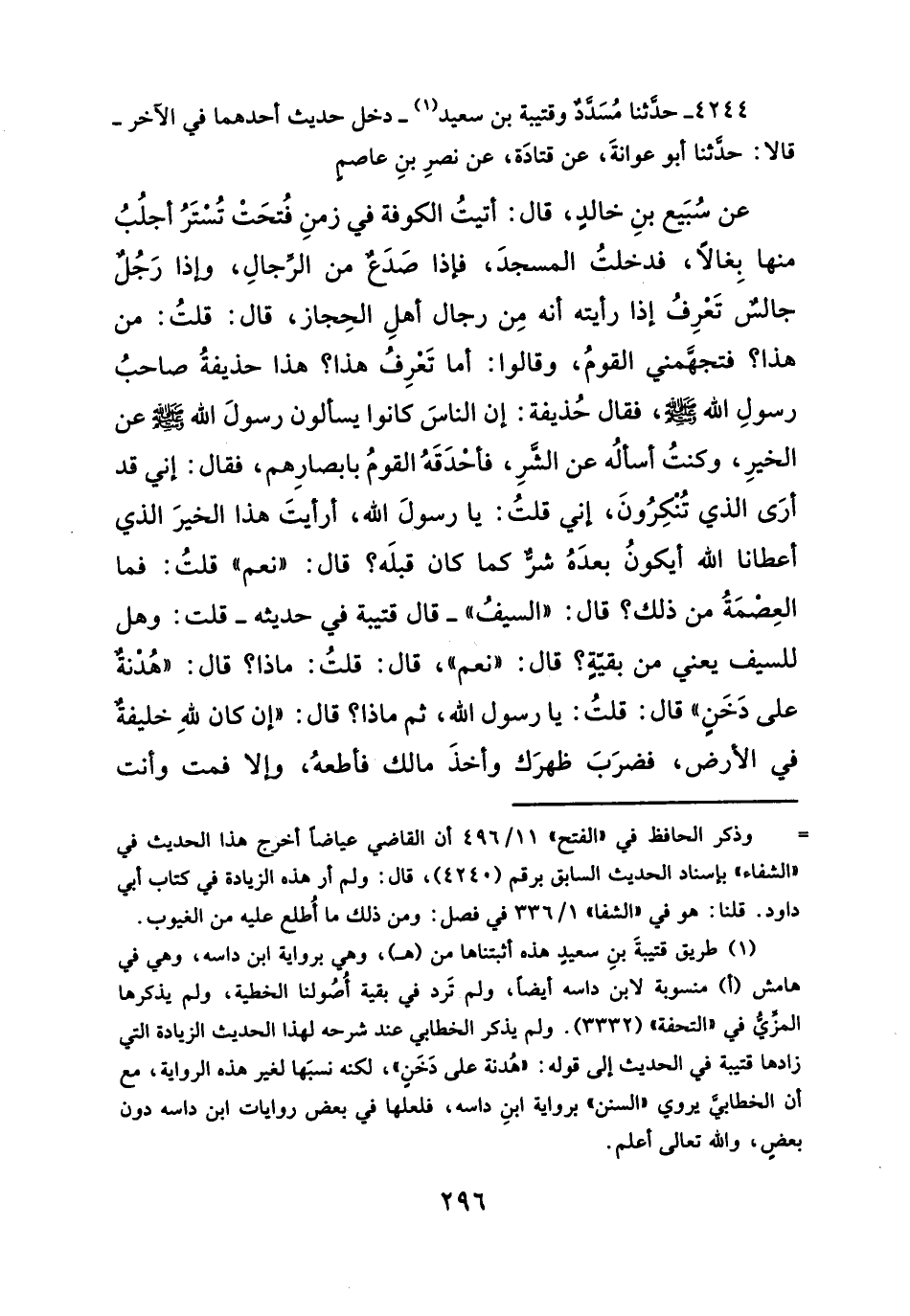 عن سُبَيع بنِ خالدٍ، قال: أتيتُ الكوفة في زمنِ فُتحَتْ تُسْتَرُ أجلُبُ منها بِغالاً، فدخلتُ المسجدَ، فإذا صَدَعٌ من الرِّجالِ، وإذا رَجُلٌ جالسٌ تَعْرِفُ إذا رأيته أنه مِن رجال أهلِ الحِجاز، قال: قلتُ: من هذا؟ فتجهَّمني القومُ، وقالوا: أما تَعْرِفُ هذا؟ هذا حذيفةُ صاحبُ رسولِ الله - صلَّى الله عليه وسلم -، فقال حُذيفة: إن الناسَ كانوا يسألون رسولَ الله - صلَّى الله عليه وسلم - عن الخيرِ، وكنتُ أسألُه عن الشَّرِ، فأحْدَقَهُ القومُ بابصارِهم، فقال: إني قد أرَى الذي تُنْكِرُونَ، إني قلتُ: يا رسولَ الله، أرأيتَ هذا الخيرَ الذي أعطانا الله أيكونُ بعدَهُ شرٌّ كما كان قبلَه؟ قال: "نعم" قلتُ: فما العِصْمَةُ من ذلك؟ قال: "السيفُ " -قال قتيبة في حديثه- قلت: وهل للسيف يعني من بقيّةٍ؟ قال: "نعم"، قال: قلتُ: ماذا؟ قال: "هُدْنةٌ على دَخَنٍ" قال: قلتُ: يا رسول الله، ثم ماذا؟ قال: "إن كان لله خليفةٌ في الأرض، فضرَبَ ظهرَك وأخذَ مالك فأطعهُ، وإلا فمت وأنت