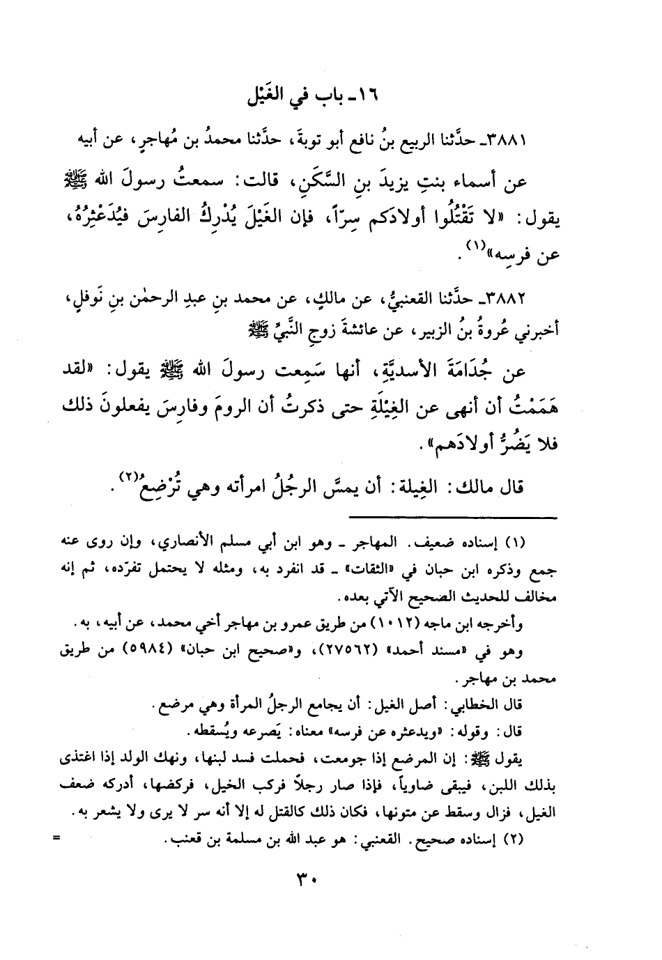 عن أسماء بنتِ يزيدَ بنِ السَّكَنِ، قالت: سمعتُ رسولَ الله - صلَّى الله عليه وسلم - يقول: "لا تَقْتُلُوا أولادَكم سِرّاً، فإن الغَيْلَ يُدْرِكُ الفارِسَ فيُدَعْثِرُهُ، عن فرسِه" (¬١).