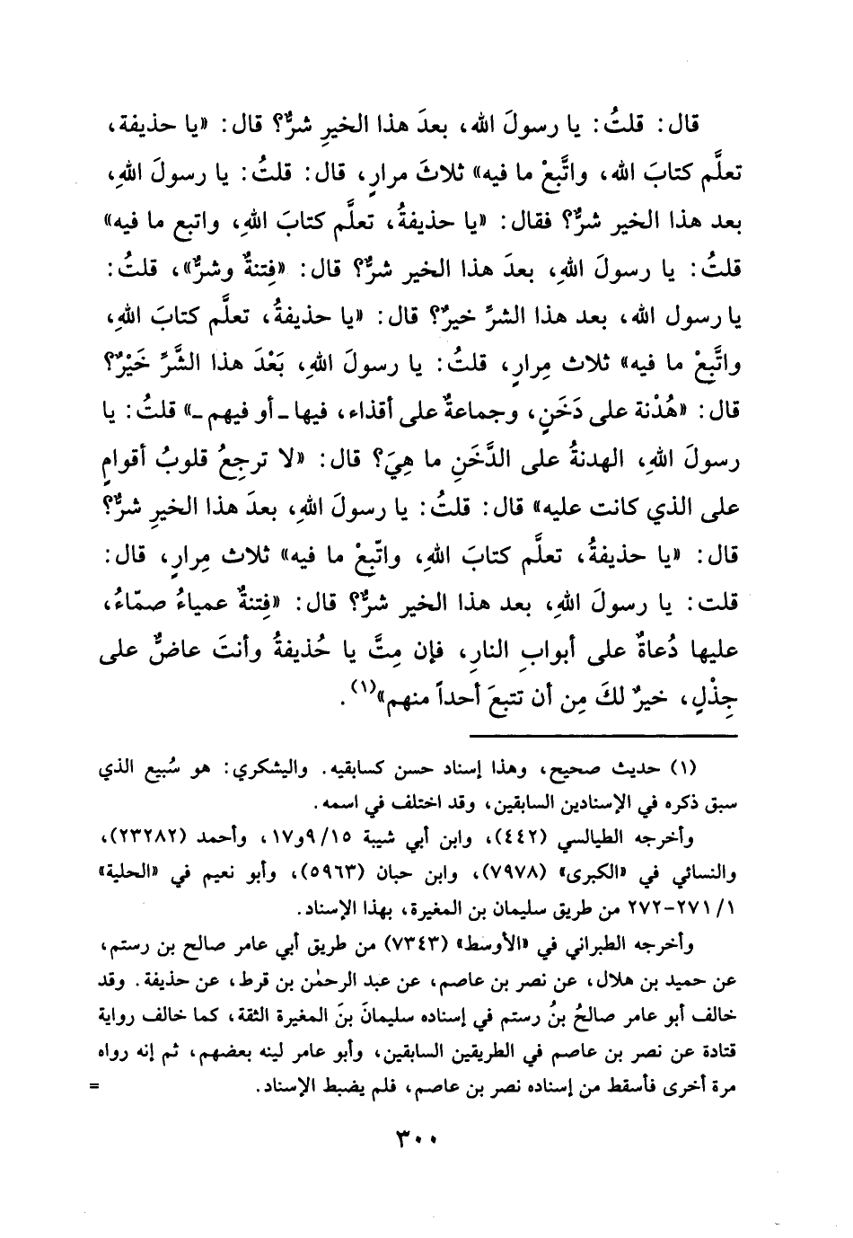 قال: قلتُ: يا رسولَ الله، بعدَ هذا الخيرِ شرٌّ؟ قال: "يا حذيفة، تعلَّم كتابَ الله، واتَّبعْ ما فيه" ثلاثَ مرارٍ، قال: قلتُ: يا رسولَ اللهِ، بعد هذا الخير شرٌّ؟ فقال: "يا حذيفةُ، تعلَّم كتابَ اللهِ، واتبع ما فيه" قلتُ: يا رسولَ الله، بعدَ هذا الخير شرٌّ؟ قال: "فِتنةٌ وشرٌّ"، قلتُ: يا رسول الله، بعد هذا الشرِّ خيرٌ؟ قال: "يا حذيفةُ، تعلَّم كتابَ اللهِ، واتَّبعْ ما فيه" ثلاث مِرارٍ، قلتُ: يا رسولَ اللهِ، بَعْدَ هذا الشَّرِّ خَيْرٌ؟ قال: "هُدْنة على دَخَنٍ، وجماعةٌ على أقذاء، فيها -أو فيهم-" قلتُ: يا رسولَ الله، الهدنةُ على الدَّخَنِ ما هِيَ؟ قال: "لا ترجِعُ قلوبُ أقوامٍ على الذي كانت عليه" قال: قلتُ: يا رسولَ الله، بعدَ هذا الخيرِ شرٌّ؟ قال: "يا حذيفةُ، تعلَّم كتابَ اللهِ، واتّبعْ ما فيه" ثلاث مِرارٍ، قال: قلت: يا رسولَ الله، بعد هذا الخير شرٌّ؟ قال: "فِتنةٌ عمياءُ صمَّاءُ، عليها دُعاةٌ على أبوابِ النارِ، فإن مِتَّ يا حُذيفةُ وأنتَ عاضٌّ على جِذْلٍ، خيرٌ لكَ مِن أن تتبعَ أحداً منهم" (¬١).