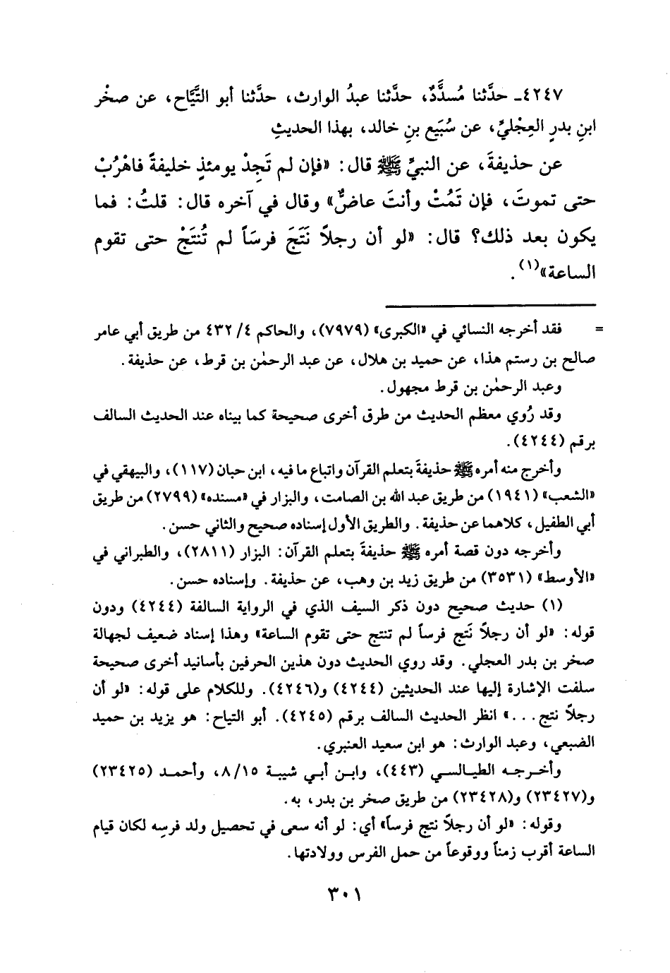 عن حذيفةَ، عن النبي - صلَّى الله عليه وسلم - قال: فإن لم تَجِدْ يومئذٍ خليفةً فاهْرُبْ حتى تموتَ، فإن تَمُتْ وأنتَ عاضٌّ" وقال في آخره قال: قلتُ: فما يكون بعد ذلك؟ قال: "لو أن رجلاً نَتَجَ فرسَاً لم تُنتَجْ حتى تقوم الساعة" (¬١).