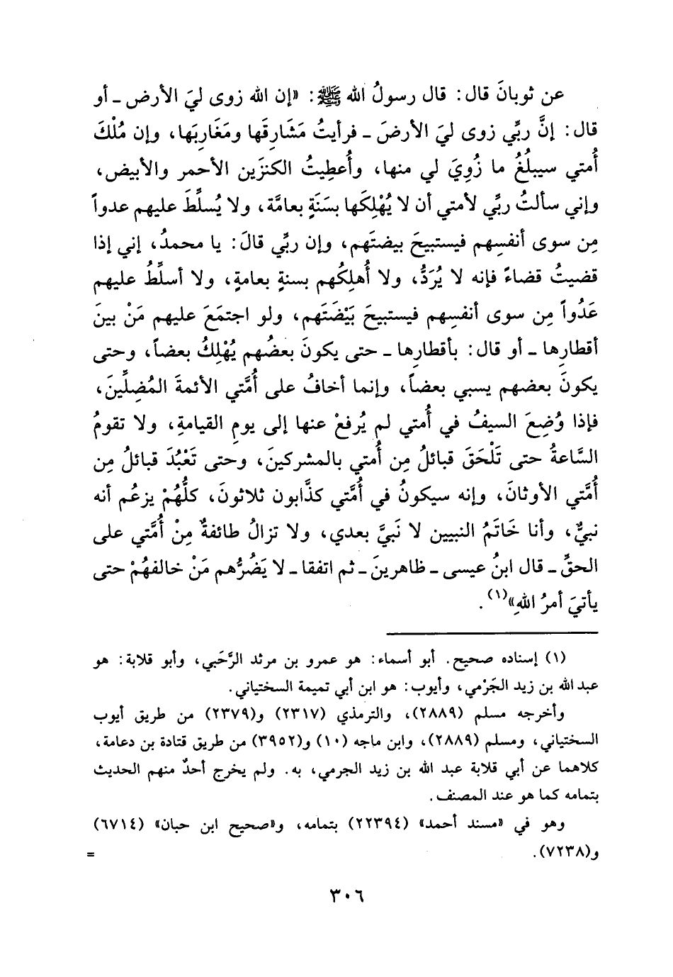 عن ثوبانَ قال: قال رسولُ الله -صلَّى الله عليه وسلم-: "إن الله زوى ليَ الأرض -أو قال: إنَّ ربِّي زوى ليَ الأرضَ- فرأيتُ مَشَارِقَها ومَغَارِبَها، وإن مُلْكَ أُمتي سيبلُغُ ما زُوِيَ لي منها، وأُعطِيتُ الكنزَين الأحمر والأبيض، وإني سألتُ ربي لأمتي أن لا يُهْلِكَها بسَنَةٍ بعافَّة، ولا يُسلِّطَ عليهم عدواً مِن سوى أنفسِهم فيستبيحَ بيضتَهم، وإن ربي قالَ: يا محمدُ، إني إذا قضيتُ قضاءً فإنه لا يُرَدُ، ولا أُهلِكُهم بسنةٍ بعامةٍ، ولا أسلِّطُ عليهم عَدُواً مِن سوى أنفسِهم فيستبيحَ بَيْضَتَهم، ولو اجتمَعَ عليهم مَنْ بين أقطارها -أو قال: بأقطارِها- حتى يكونَ بعضُهم يُهْلِكُ بعضاً، وحتى يكون بعضهم يسبي بعضاً، وإنما أخافُ على أُمَّتي الأئمةَ المُضِلَّينَ، فإذا وُضِعَ السيفُ في أُمتي لم يُرفعْ عنها إلى يومِ القيامةِ، ولا تقومُ السَّاعةُ حتى تَلْحَقَ قبائلُ مِن أُمتي بالمشركينَ، وحتى تَعبُدَ قبائلُ مِن أُمَّتي الأوثانَ، وإنه سيكونُ في أُمَّتي كذَّابون ثلاثونَ، كلُّهُمْ يزعُم أنه نبيّ، وأنا خَاتَمُ النبيين لا نَبيَّ بعدي، ولا تزالُ طائفةٌ مِنْ أمَّتي على الحق -قال ابنُ عيسى- ظاهرينَ -ثم اتفقا- لا يَضُرُّهم مَنْ خالفهُمْ حتى يأتيَ أمرُ اللهِ" (¬١).