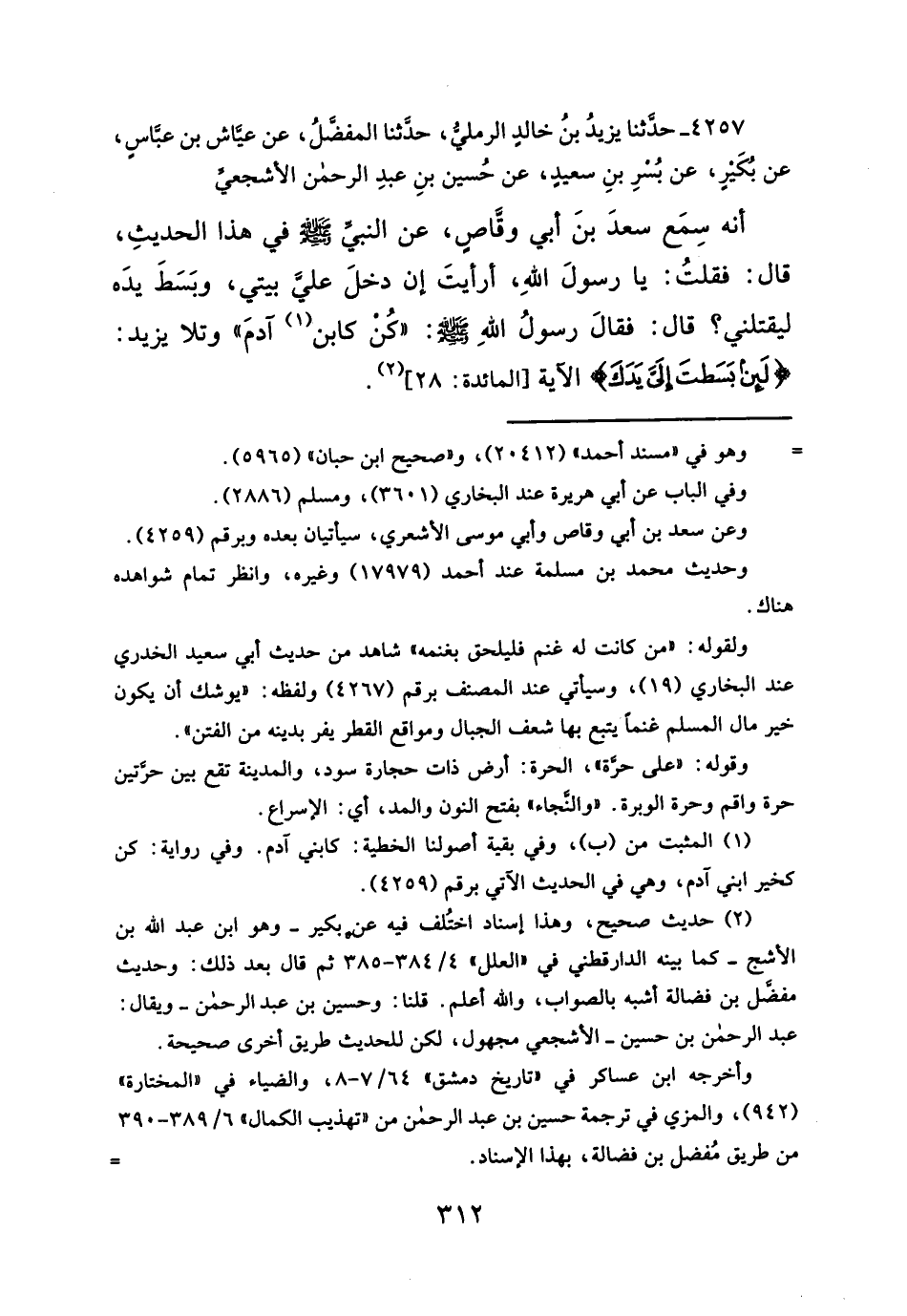 أنه سمَع سعدَ بنَ أبي وقَّاصِ، عن النبيِّ -صلَّى الله عليه وسلم- في هذا الحديثِ، قال: فقلتُ: يا رسولَ الله، أرأيتَ إن دخلَ عليَّ بيتي، وبَسَطَ يدَه ليقتلني؟ قال: فقالَ رسولُ الله - صلَّى الله عليه وسلم - "كُنْ كابن (¬١) آدمَ" وتلا يزيد: {لَئِنْ بَسَطْتَ إِلَيَّ يَدَكَ} الآية [المائدة:٢٨] (¬٢)