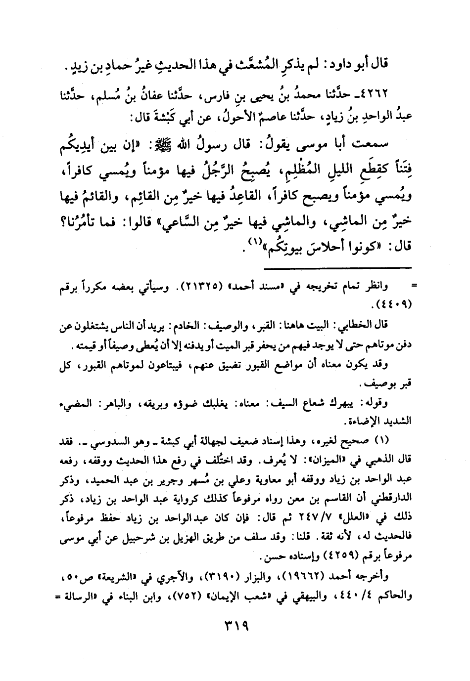 سمعت أبا موسى يقولُ: قال رسولُ الله - صلَّى الله عليه وسلم -: "إن بين أيدِيكُم فِتَنأ كقِطَعِ الليلِ المُظلِمِ، يُصبِحُ الرَّجُلُ فيها مؤمناً ويُمسي كافراً، ويُمسي مؤمناً ويصبح كافراً، القاعِدُ فيها خير مِن القائِم، والقائمُ فيها خيرٌ مِن الماشِي، والماشِي فيها خير مِن السَّاعي قالوا: فما تأمُرُنا؟ قال: "كونوا أحلاسَ بيوتِكُم" (¬١).