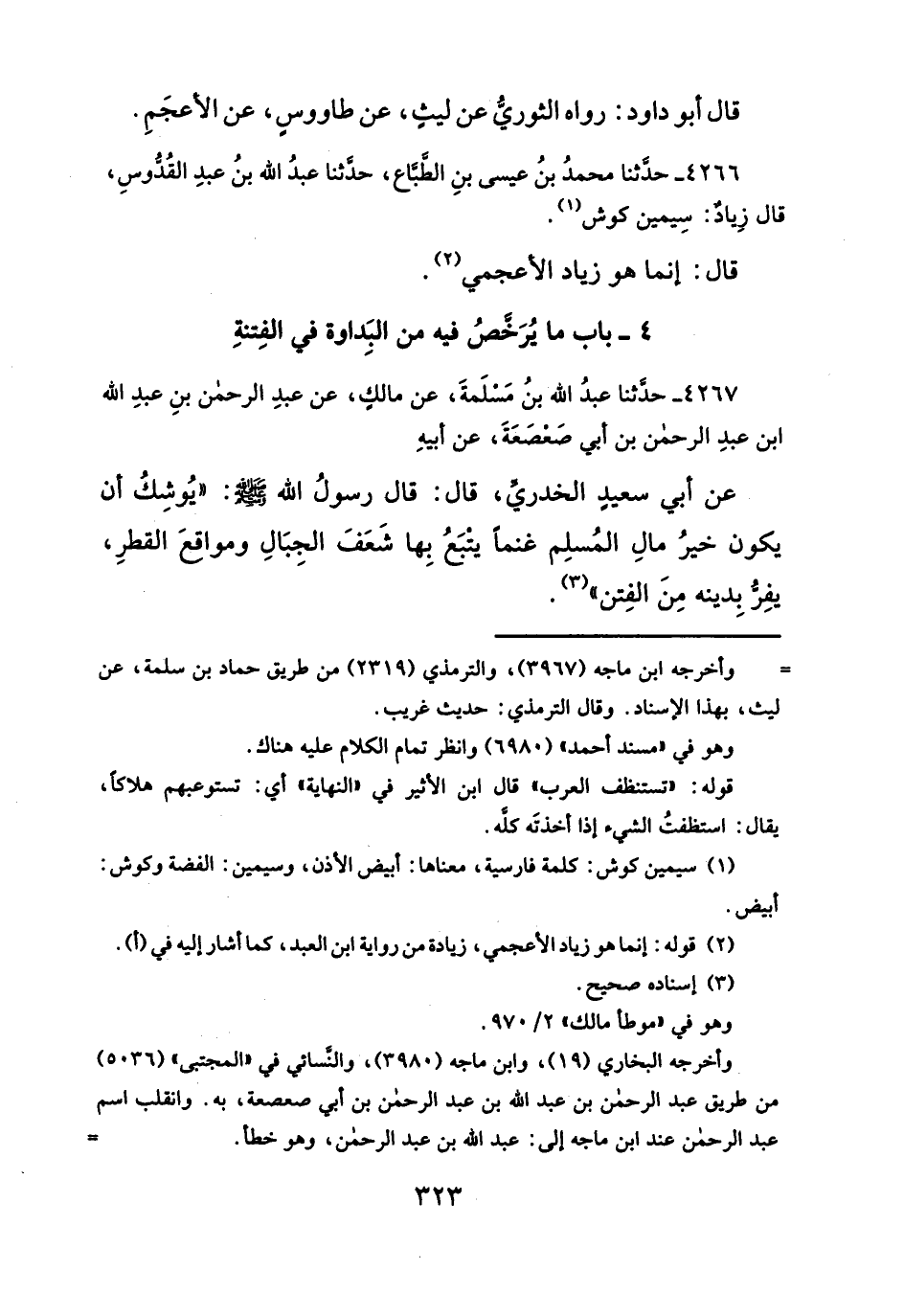 عن أبي سعيدِ الخدريِّ، قال: قال رسولُ الله - صلَّى الله عليه وسلم -: "يُوشِكُ أن يكون خيرُ مالِ المُسلِم غنماً يتْبَعُ بِها شَعَفَ الجِبَالِ ومواقعَ القطرِ، يفِرُّ بِدينه مِنَ الفِتن" (¬٣).