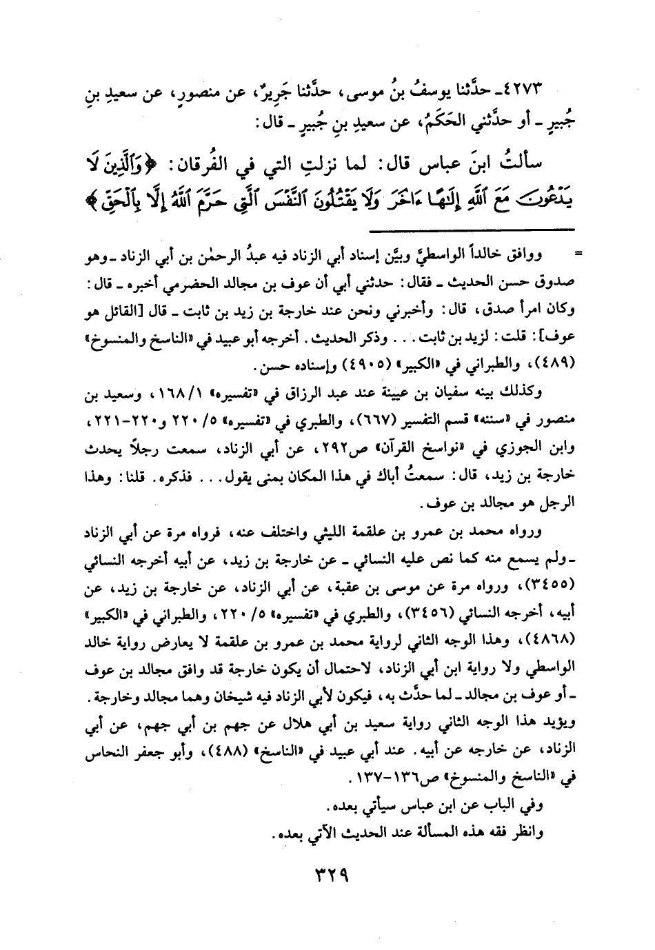 ورواه محمَّد بن عمرو بن علقمة الليثى واختلف عنه، فرواه مرة عن أبي الزناد -ولم يسمع منه كما نص عليه النسائي- عن خارجة بن زيد، عن أبيه أخرجه النسائي (٣٤٥٥)، ورواه مرة عن موسى بن عقبة، عن أبي الزناد، عن خارجة بن زيد، عن أبيه، أخرجه النسائي (٣٤٥٦)، والطبري في "تفسيره" ٥/ ٢٢٠، والطبراني في "الكبير" (٤٨٦٨)، وهذا الوجه الثاني لرواية محمَّد بن عمرو بن علقمة لا يعارض رواية خالد الواسطي ولا رواية ابن أبي الزناد، لاحتمال أن يكون خارجة قد وافق مجالد بن عوف -أو عوف بن مجالد- لما حدَّث به، فيكون لأبي الزناد فيه شيخان وهما مجالد وخارجة.