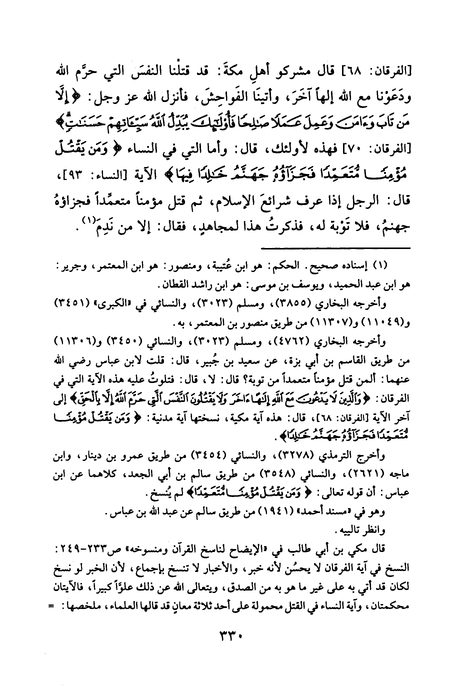 وأخرجه البخاري (٤٧٦٢)، ومسلم (٣٠٢٣)، والنسائي (٣٤٥٠) و (١١٣٠٦) من طريق القاسم بن أبي بزة، عن سعيد بن جُبير، قال: قلت لابن عباس رضي الله عنهما: ألمن قل مؤمناً متعمداً من توبة؟ قال: لا، قال: فتلوتُ عليه هذه الآية التي في الفرقان: {وَالَّذِينَ لَا يَدْعُونَ مَعَ اللَّهِ إِلَهًا آخَرَ وَلَا يَقْتُلُونَ النَّفْسَ الَّتِي حَرَّمَ اللَّهُ إِلَّا بِالْحَقِّ} إلى آخر الآية [الفرقان: ٦٨]، قال: هذه آية مكية، نسختها آية مدنية: {وَمَنْ يَقْتُلْ مُؤْمِنًا مُتَعَمِّدًا فَجَزَاؤُهُ جَهَنَّمُ خَالِدًا}.