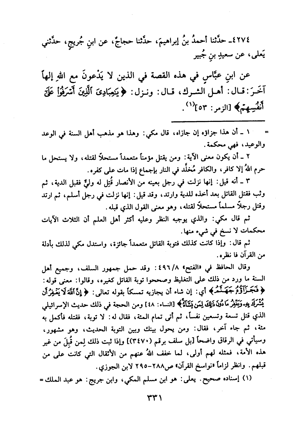 عن ابنِ عبَّاسٍ في هذه القصة في الذين لا يَدعونَ مع الله إلهاً آخَرَ: قال: أهل الشرك، قال: ونزل: {يَا عِبَادِيَ الَّذِينَ أَسْرَفُوا عَلَى أَنْفُسِهِمْ} [الزمر:٥٣] (¬١).