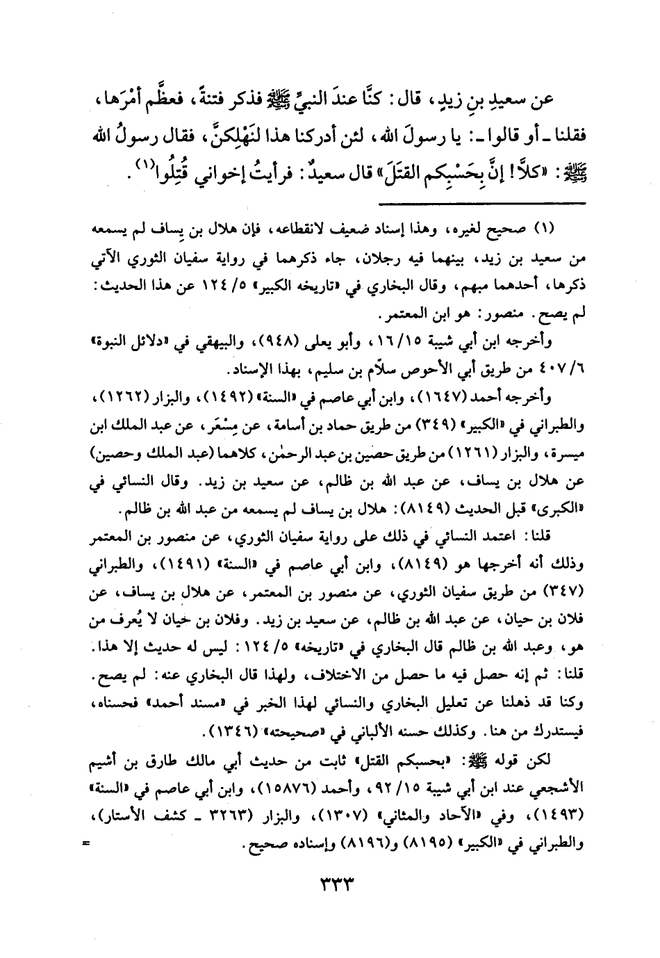 عن سعيدِ بنِ زيدٍ، قال: كنَّا عندَ النبيِّ - صلَّى الله عليه وسلم - فذكر فتنةً، فعظَّم أمْرَها، فقلنا -أو قالوا-: يا رسولَ الله، لئن أدركنا هذا لنَهلِكنَّ، فقال رسولُ الله - صلَّى الله عليه وسلم -: "كلَاّ! إنَّ بِحَسْبِكم القتَلَ" قال سعيدٌ: فرأيتُ إخواني قُتِلُوا (¬١).