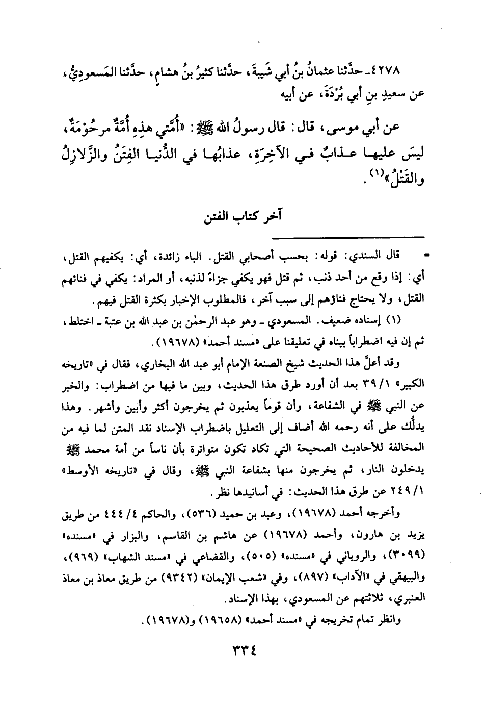 عن أبي موسى، قال: قال رسولُ الله - صلَّى الله عليه وسلم -: أُمَّتي هذِهِ أُمَّةٌ مرحُوْمَةٌ، ليسَ عليها عذابٌ في الآخِرَةِ، عذابُها في الدُّنيا الفِتَنُ والزَّلازِلُ والقَتلُ" (¬١).