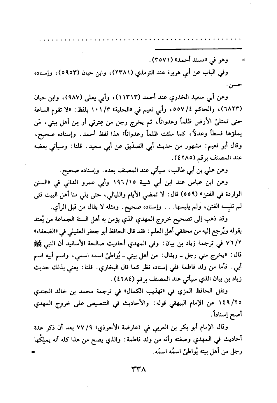 وقد ذهب إلى تصحيح خروج المهدي الذي يؤمن به أهل السنة الجماعة من يُعتد بقوله ويُرجع إليه من محققي أهل العلم: فقد قال الحافظ أبو جعفر العقيلي في "الضعفاء" ٢/ ٧٦ في ترجمة زياد بن بيان: وفي المهدي أحاديث صالحة الأسانيد أن النبي - صلَّى الله عليه وسلم - قال: "يخرج مني رجل -ويقال: من أهل بيتي- يُواطئ اسمه اسمي، واسم أبيه اسم أبي. فأما من ولد فاطمة ففي إسناده نظر كما قال البخاري. قلنا: يعني بذلك حديث زياد بن بيان الذي سيأتي عند المصنف برقم (٤٢٨٤).