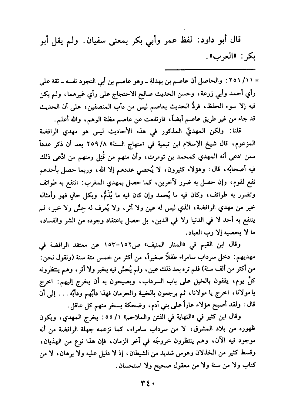 وقال ابن القيم في "المنار المنيف" ص ١٥٢ - ١٥٣ عن معتقد الرافضة في مهديهم: دخل سرداب سامراء طفلاً صغيراً، من أكثر من خمس مئة سنة (ونقول نحن: من أكثر من ألف سنة) فلم تره بعد ذلك عين، ولم يُحسَّ فيه بخبر ولا أثر، وهم ينتظرونه كلَّ يوم، يقفون بالخيل على باب السرداب، ويصيحون به أن يخرج إليهم: اخرج يا مولانا، اخرج يا مولانا، ثم يرجعون بالخيبة والحرمان فهذا دأبُهم ودأبُه ... إلى أن قال: ولقد أصبح هؤلاء عاراً على بني آدم، وضحكة يسخر منهم كل عاقل.