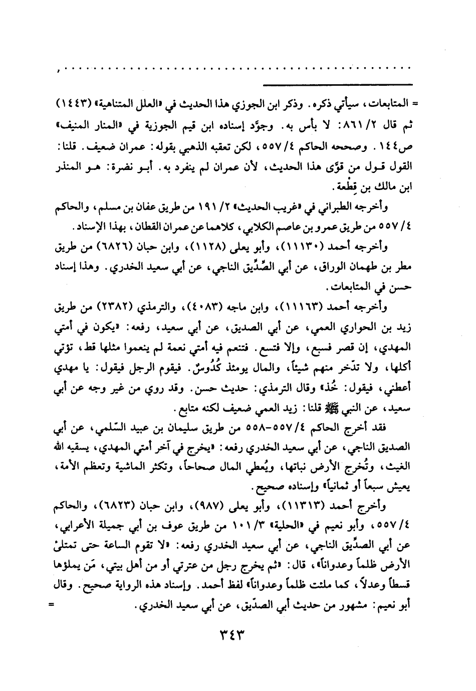وأخرجه أحمد (١١١٦٣)، وابن ماجه (٤٠٨٣)، والترمذي (٢٣٨٢) من طريق زيد بن الحواري العمي، عن أبي الصديق، عن أبي سعيد، رفعه: "يكون في أمتي المهدي، إن قصر فسبع، وإلا فتسع. فتنعم فيه أمتي نعمة لم ينعموا مثلها قط، تؤتي أكلها، ولا تدّخر منهم شيئاً، والمال يومئذ كُدُوسٌ. فيقوم الرجل فيقول: يا مهدي أعطني، فيقول: خُذ" وقال الترمذي: حديث حسن. وقد روي من غير وجه عن أبي سعيد، عن النبي - صلَّى الله عليه وسلم - قلنا: زيد العمي ضعيف لكنه متابع.