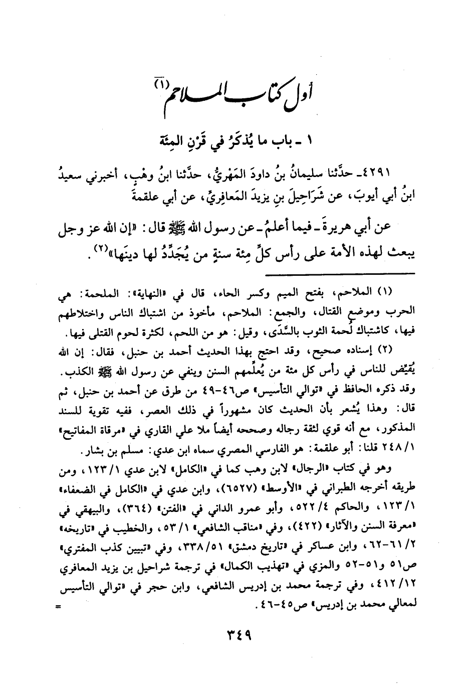 (¬٢) إسناده صحيح، وقد احتج بهذا الحديث أحمد بن حنبل، فقال: إن الله يُقيِّض للناس في رأس كل مئة من يُعلِّمهم السنن وينفي عن رسول الله - صلَّى الله عليه وسلم - الكذب.