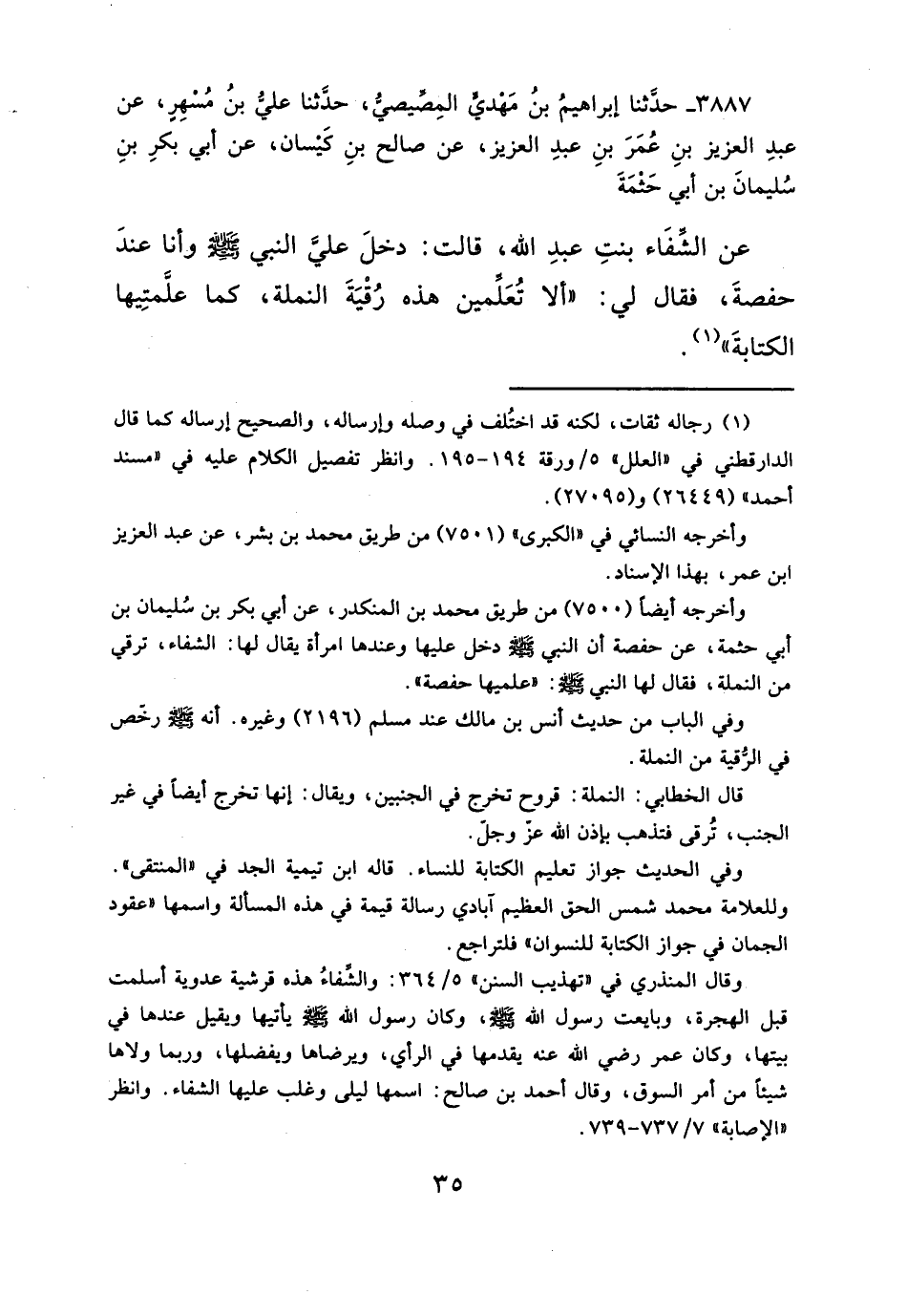 وأخرجه أيضاً (٧٥٠٠) من طريق محمد بن المنكدر، عن أبي بكر بن سُليمان بن أبي حثمة، عن حفصة أن النبي - صلَّى الله عليه وسلم - دخل عليها وعندها امرأة يقال لها: الشفاء، ترقي من النملة، فقال لها النبي - صلَّى الله عليه وسلم -: "علميها حفصة".