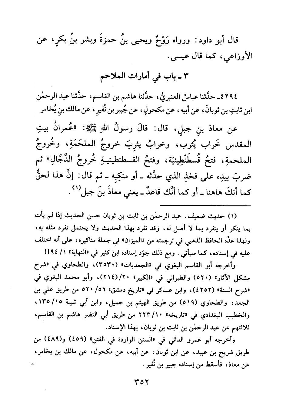 عن معاذ بنِ جبلِ، قال: قالَ رسولُ الله - صلَّى الله عليه وسلم -: "عُمرانُ بيتِ المقدس خَراب يُثرب، وخرابُ يُثرِبَ خروجُ الملحَمَةِ، وخُروجُ الملحمةِ، فتحُ قُسطَنْطِينيَة، وفتحُ القسطنطينيةِ خُروجُ الدَّجَّالِ" ثم ضربَ بيدِه على فخذِ الذي حدَّثه -أو منكِبِه- ثم قال: إنَّ هذا لحقٌ كما أنكَ ها هنا -أوكما أنَّك قاعدٌ- يعني معاذَ بنَ جبل (¬١).