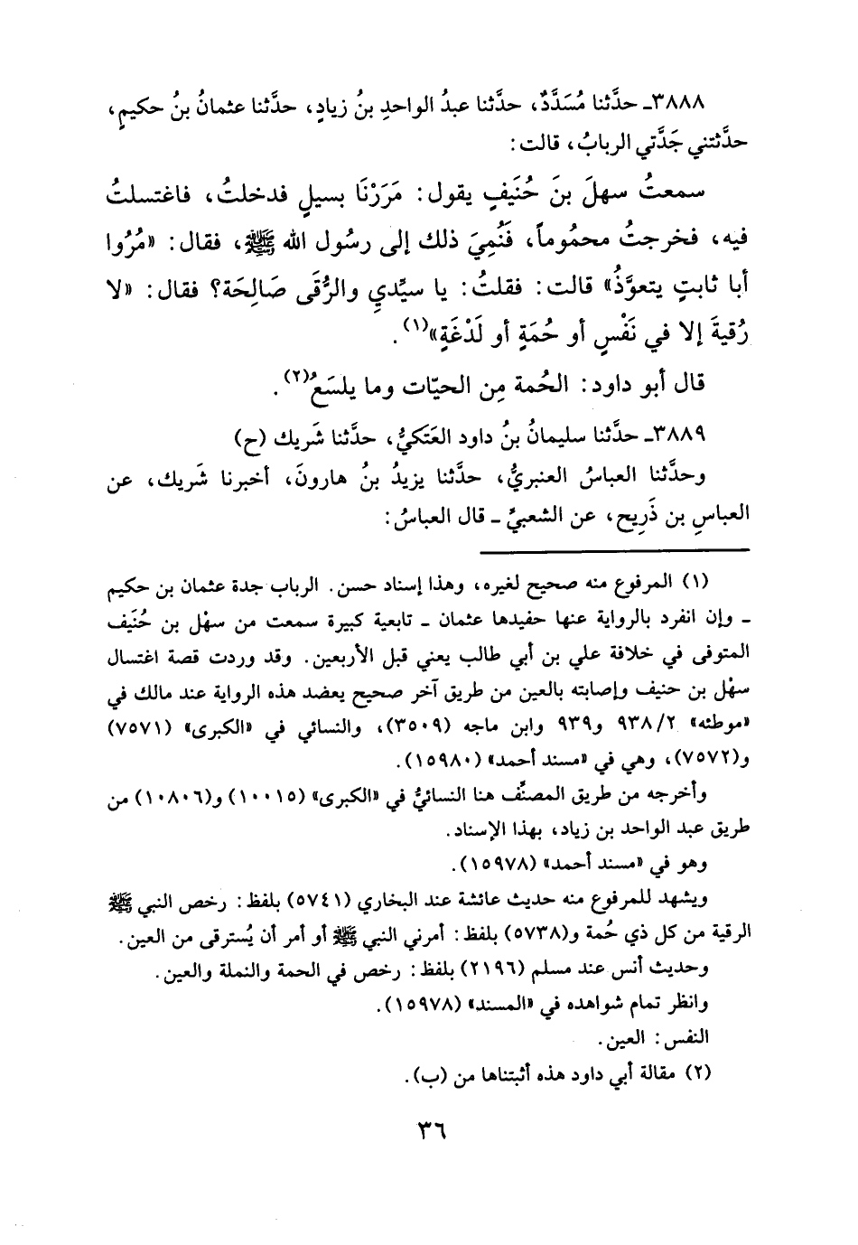 سمعتُ سهلَ بنَ حُنَيفِ يقول: مَرَرْنَا بسيلٍ فدخلتُ، فاغتسلتُ فيه، فخرجتُ محمُوماً، فَنُمِيَ ذلك إلى رسُول الله -صلَّى الله عليه وسلم-، فقال: "مُرُوا أبا ثابتٍ يتعوَّذُ" قالت: فقلتُ: يا سيِّديِ والرُّقَى صَالِحَة؟ فقال: "لا رُقيةَ إلا في نَفْسٍ أو حُمَةٍ أو لَدْغَةٍ" (¬١).