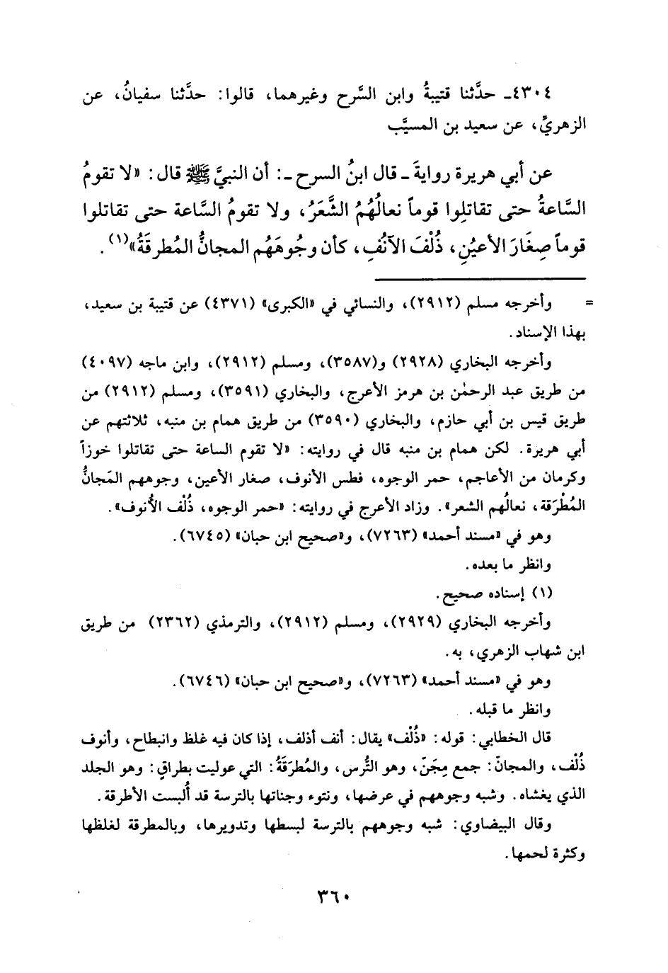 عن أبي هريرة روايةَ -قال ابنُ السرح-: أن النبي - صلَّى الله عليه وسلم - قال: "لا تقومُ السَّاعةُ حتى تقاتلِوا قوماً نعالُهُمُ الشَّعَرُ، ولا تقومُ السَّاعة حتى تقاتلوا قوماً صِغَارَ الأعيُنِ، ذُلْفَ الآنُفِ، كأن وجُوهَهُم المجانُّ المُطرقَةُ" (¬١).
