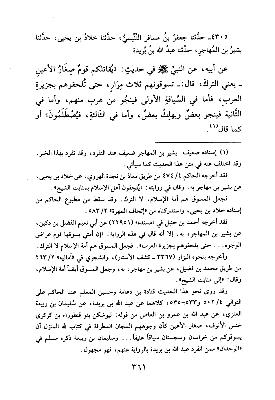 وقد روى نحو هذا الحديث قتادة بن دعامة وحسين المعلم عند الحاكم على التوالي ٤/ ٥٠٢ و ٥٣٣ - ٥٣٥، كلاهما عن عبد الله بن بريدة، عن سُليمان بن ربيعة العنزي، عن عبد الله بن عمرو بن العاص من قوله: ليوشكن بنو قنطوراء بن كركرى خنس الأنوف، صغار الأعين كأن وجوههم المجان المطرقة في كتاب لله المنزل أن يسوقوكم من خراسان وسجستان سياقاً عنيفاً ... وسليمان بن ربيعة ذكره مسلم في "الوحدان" ممن انفرد عبد الله بن بريدة بالرواية عنهم، فهو مجهول.