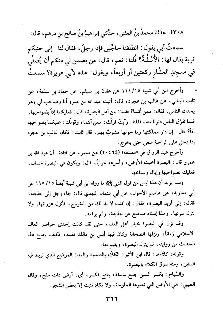 = وأخرج ابن أبي شيبة ١٥/ ١١٤ عن عفان بن مسلم، عن حماد بن سلمة، عن ثابت البناني، عن غالب بن عجرد، قال: أتيت عبد الله بن عمرو أنا وصاحب لي وهو يحدث الناس، فقال: ممن أنتما؟ فقلنا: من أهل البصرة، قال: فعليكما إذاً بضواجها، فلما تفرَّق الناس دنونا منه، فقلنا: رأيتَ قولَك: ممن أنتما، وقولَك: عليكما بضواحيها إذاً؟ قال: إن دار مملكتها وما حولها مشوبٌ بهم. قال ثابت: فكان غالب بن عجرد إذا دخل على الراحبة سعى حتى يخرج.