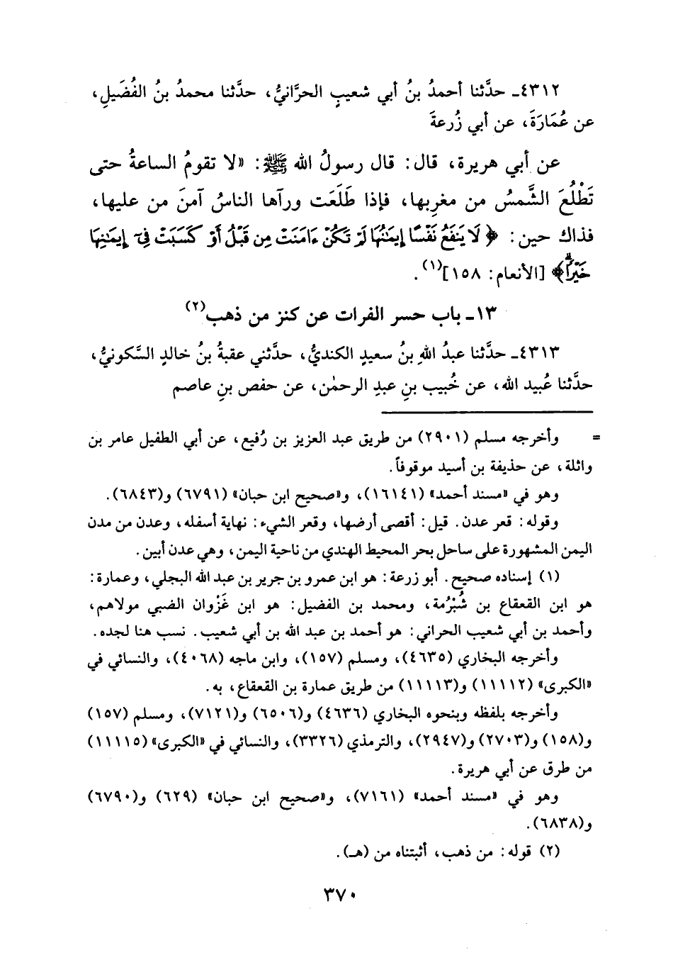 عن. أبي هريرة، قال: قال رسولُ الله - صلَّى الله عليه وسلم -: "لا تقومُ الساعةُ حتى تَطْلُعَ الشَّمسُ من مغرِبها، فإذا طَلَعَت ورآها الناسُ آمنَ من عليها، فذاك حين: {لَا يَنْفَعُ نَفْسًا إِيمَانُهَا لَمْ تَكُنْ آمَنَتْ مِنْ قَبْلُ أَوْ كَسَبَتْ فِي إِيمَانِهَا خَيْرًا} [الأنعام: ١٥٨] (¬١).