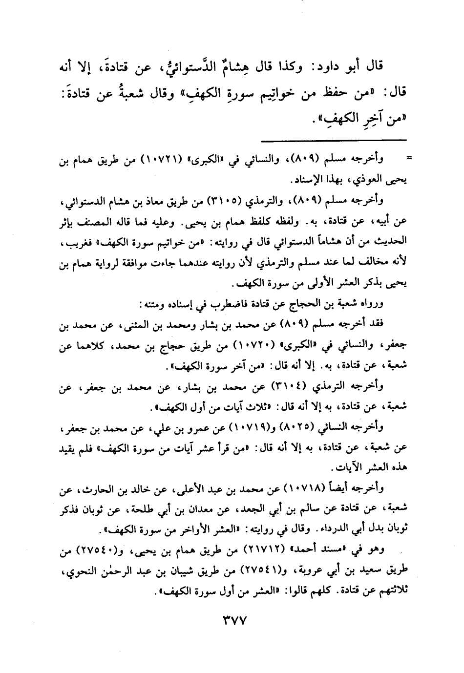 قال أبو داود: وكذا قال هِشامٌ الدَّستوائيُّ، عن قتادةَ، إلا أنه قال: "من حفظ من خواتِيم سورةِ الكهفِ" وقال شعبةُ عن قتادةَ: "من آخِرِ الكهفِ".