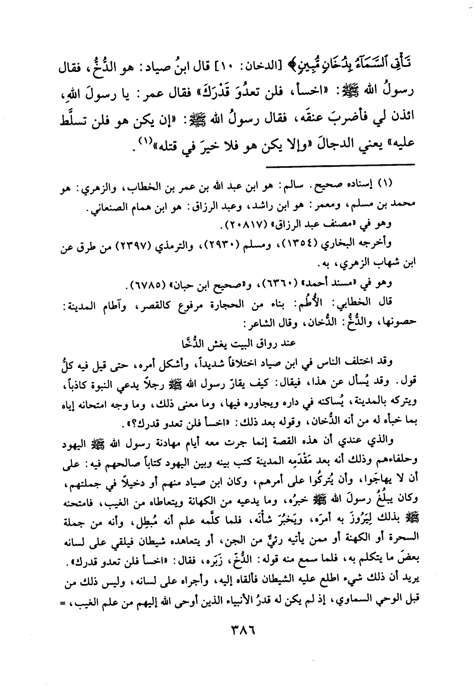تَأْتِي السَّمَاءُ بِدُخَانٍ مُبِينٍ} [الدخان:١٠] قال ابنُ صياد: هو الدُّخُّ، فقال رسولُ الله - صلَّى الله عليه وسلم -: "اخسأ، فلن تعدُوَ قَدْرَكَ" فقال عمر: يا رسولَ الله، ائذن لي فأضربَ عنقَه، فقال رسولُ الله - صلَّى الله عليه وسلم -: "إن يكن هو فلن تسلَّط عليه " يعني الدجالَ "وإلا يكن هو فلا خيرَ في قتله" (¬١).