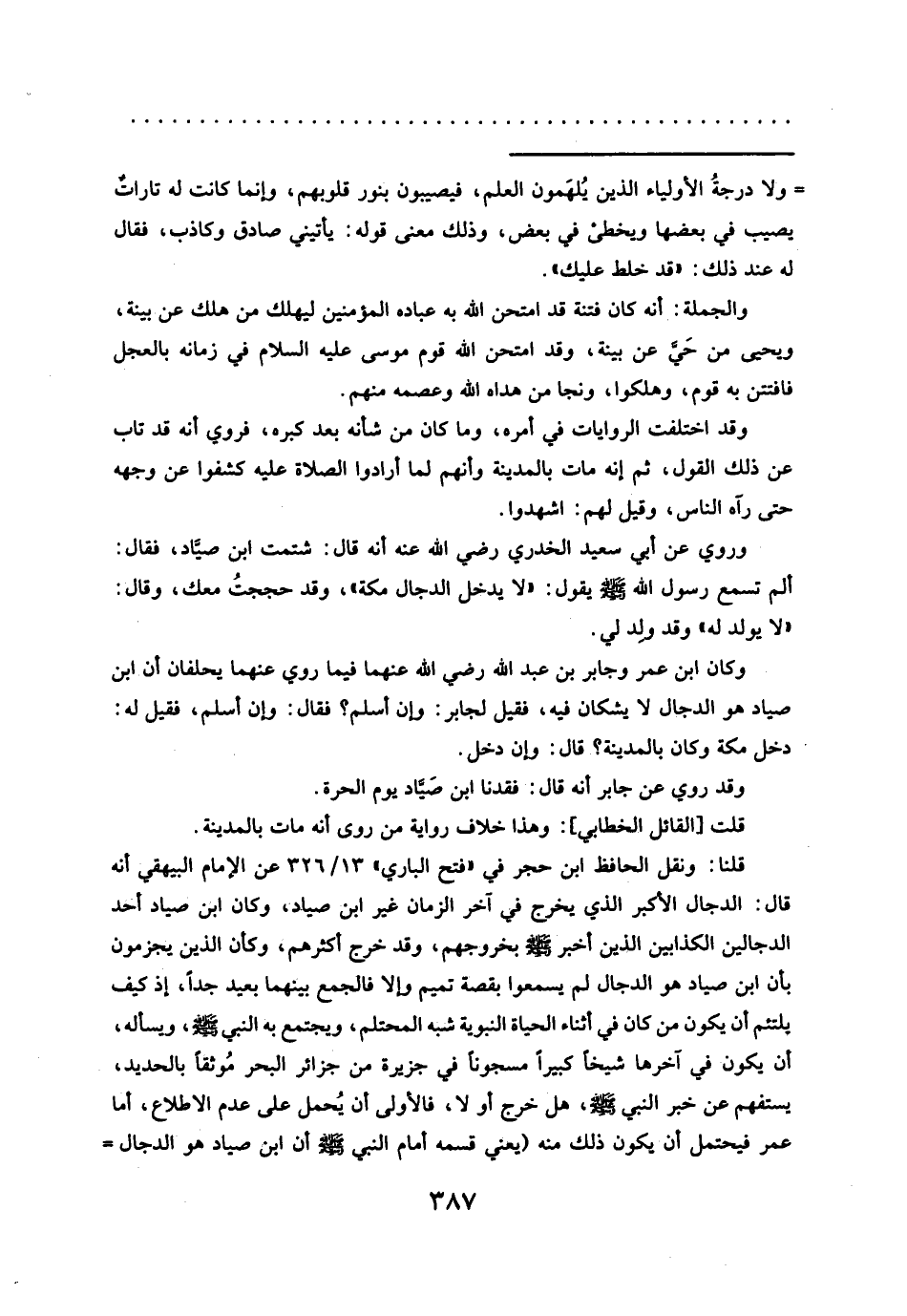 وكان ابن عمر وجابر بن عبد الله رضي الله عنهما فيما روي عنهما يحلفان أن ابن صياد هو الدَّجَّال لا يشكان فيه، فقيل لجابر: وإن أسلم؟ فقال: وإن أسلم، فقيل له: دخل مكة وكان بالمدينة؟ قال: وإن دخل.