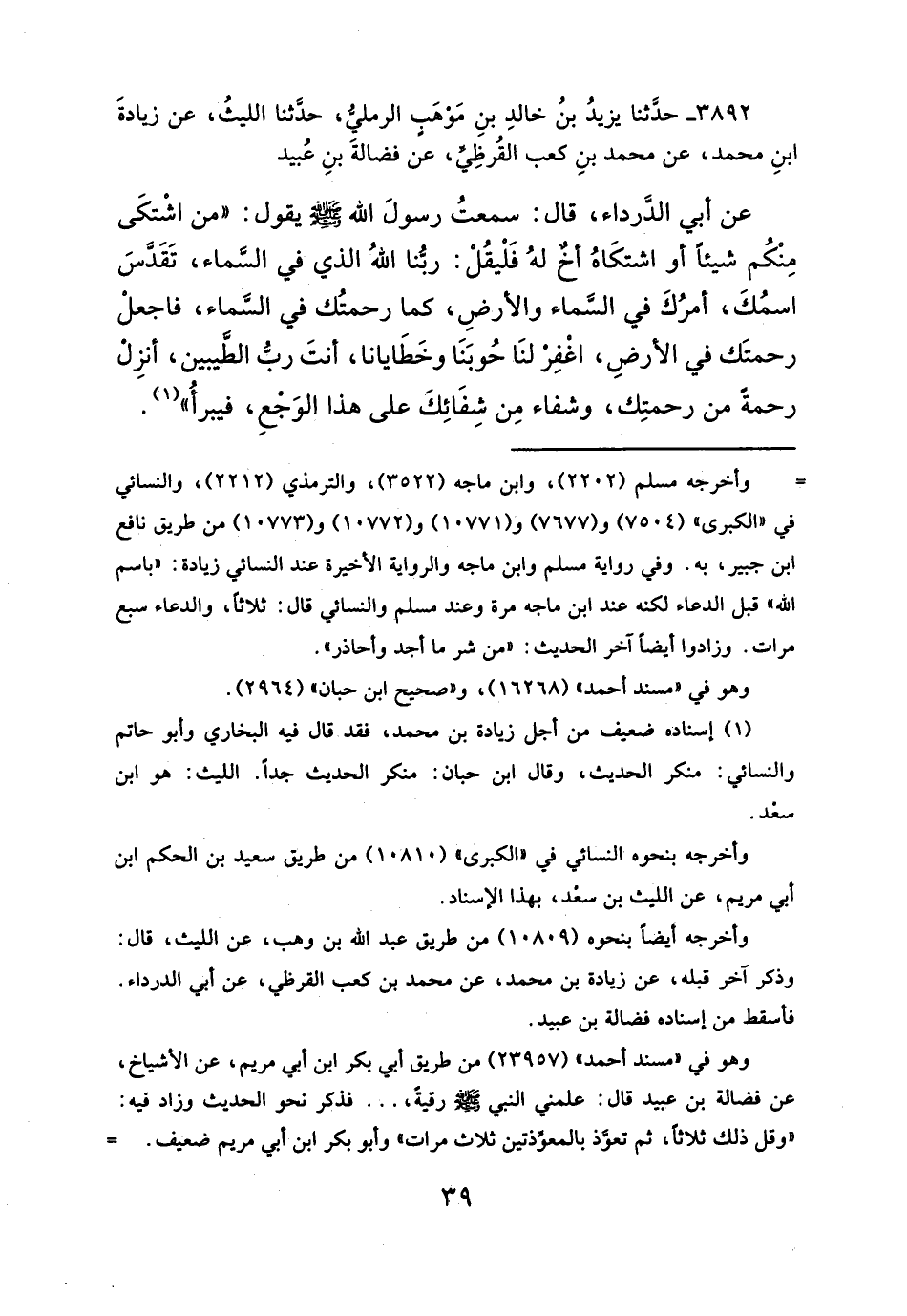 عن أبي الدَّرداء، قال: سمعتُ رسولَ الله - صلَّى الله عليه وسلم - يقول: "من اشْتكَى مِنْكُم شيئاً أو اشتكَاهُ أخٌ لهُ فَلْيقُلْ: ربُّنا اللهُ الذي في السَّماء، تَقَدَّسَ اسمُكَ، أمرُكَ في السَّماء والأرضِ، كما رحمتُك في السَّماء، فاجعلْ رحمتَك في الأرضِ، اغْفِرْ لنَا حُوبَنَا وخَطَايانا، أنتَ ربُّ الطَّيبين، أنزِلْ رحمةً من رحمتِك، وشفاء مِن شِفَائِكَ على هذا الوَجْعِ، فيبرأُ" (¬١).