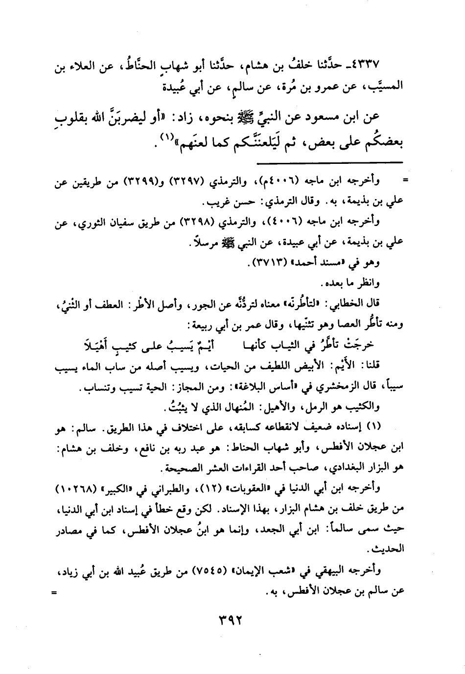 ٤٣٣٧ - حدَّثنا خلفُ بن هشام، حدَّثنا أبو شهاب الحنَّاطُ، عن العلاء بن المسيِّب، عن عمرو بن مُرة، عن سالمٍ، عن أبي عُبيدة