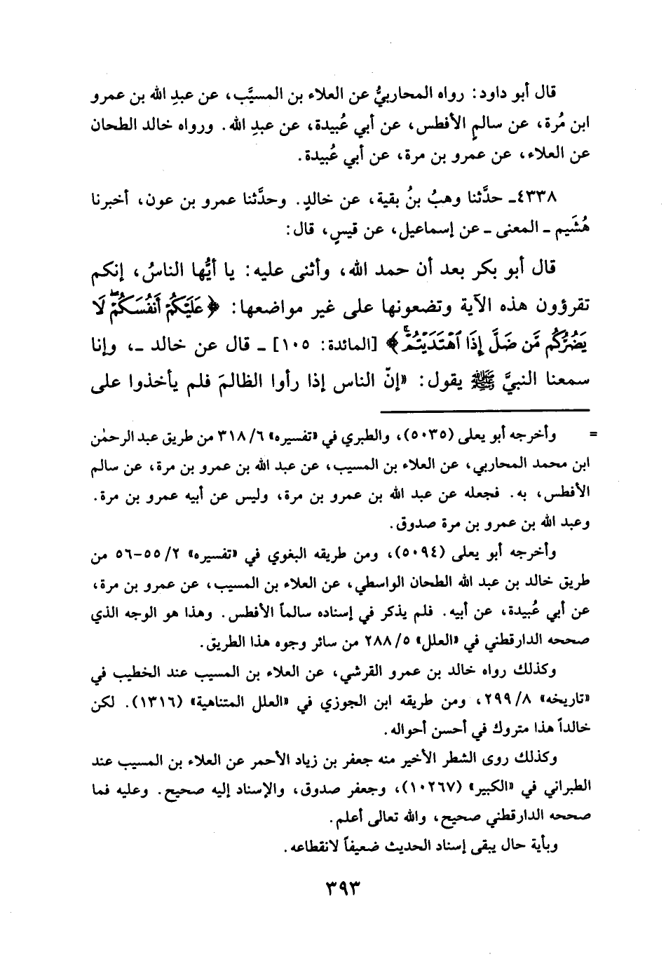 قال أبو بكر بعد أن حمد الله، وأثنى عليه: يا أيها الناسُ، إنكم تقرؤون هذه الآية وتضعونها على غير مواضعها: {عَلَيْكُمْ أَنْفُسَكُمْ لَا يَضُرُّكُمْ مَنْ ضَلَّ إِذَا اهْتَدَيْتُمْ} [المائدة:١٠٥]-قال عن خالد-، وإنا سمعنا النبيَّ -صلَّى الله عليه وسلم- يقول: "إنّ الناس إذا رأوا الظالمَ فلم يأخذوا على