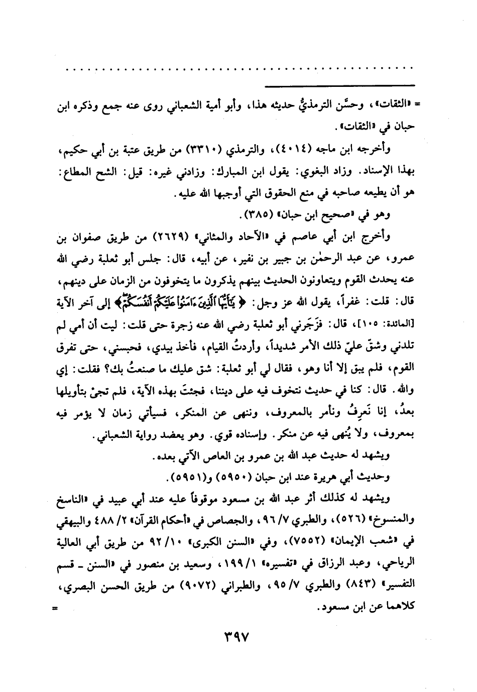 وأخرج ابن أبي عاصم في "الآحاد والمثاني" (٢٦٢٩) من طريق صفوان بن عمرو، عن عبد الرحمن بن جبير بن نفير، عن أبيه، قال: جلس أبو ثعلبة رضي الله عنه يحدث القوم ويتعاونون الحديث بينهم يذكرون ما يتخوفون من الزمان على دينهم، قال: قلت: غفراً، يقول الله عز وجل: {أَيُّهَا الَّذِينَ آمَنُوا عَلَيْكُمْ أَنْفُسَكُمْ} إلى آخر الآية [المائدة:١٠٥]، قال: فزَجَرني أبو ثعلبة رضي الله عنه زجرة حتى قلت: ليت أن أمي لم تلدني وشقّ علىّ ذلك الأمر شديداً، وأردتُ القيام، فأخذ بيدي، فحبسني، حتى تفرق القوم، فلم يبق إلا أنا وهو، فقال لي أبو ثعلبة: شق عليك ما صنعتُ بك؟ فقلت: إي والله. قال: كنا في حديث نتخوف فيه على ديننا، فجئتَ بهذه الآية، فلم تجئ بتأويلها بعدُ، إنا نَعرِفُ ونأمر بالمعروف، وننهى عن المنكر، فسيأتي زمان لا يؤمر فيه بمعروف، ولا يُنهى فيه عن منكر. وإسناده قوي. وهو يعضد رواية الشعباني.