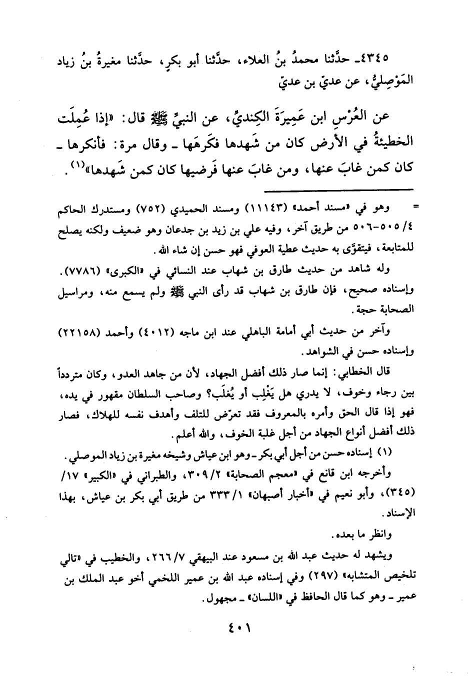 عن العُرْسِ ابن عَمِيرَةَ الكِندي، عن النبيَّ -صلَّى الله عليه وسلم- قال: "إذا عُمِلَت الخطيئةُ في الأرض كان من شَهدها فكَرهَها -وقال مرة: فأنكرها- كان كمن غابَ عنها، ومن غابَ عنها فَرضيها كان كمن شَهدها" (¬١).